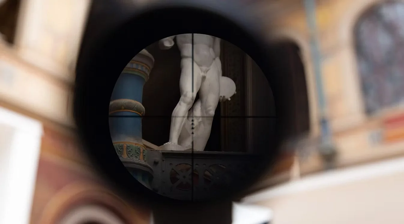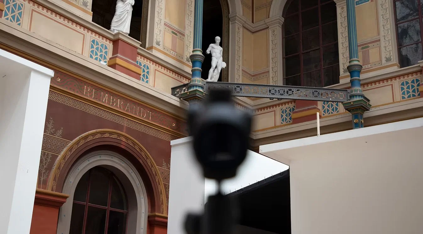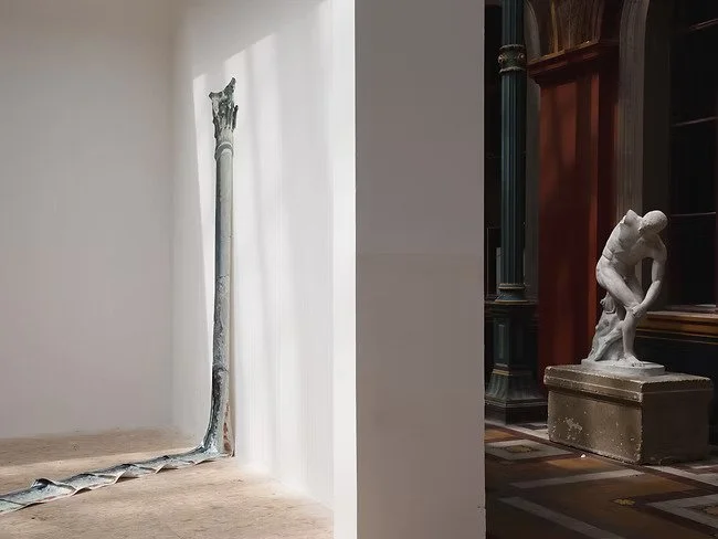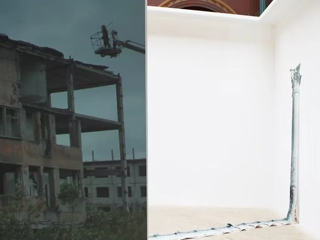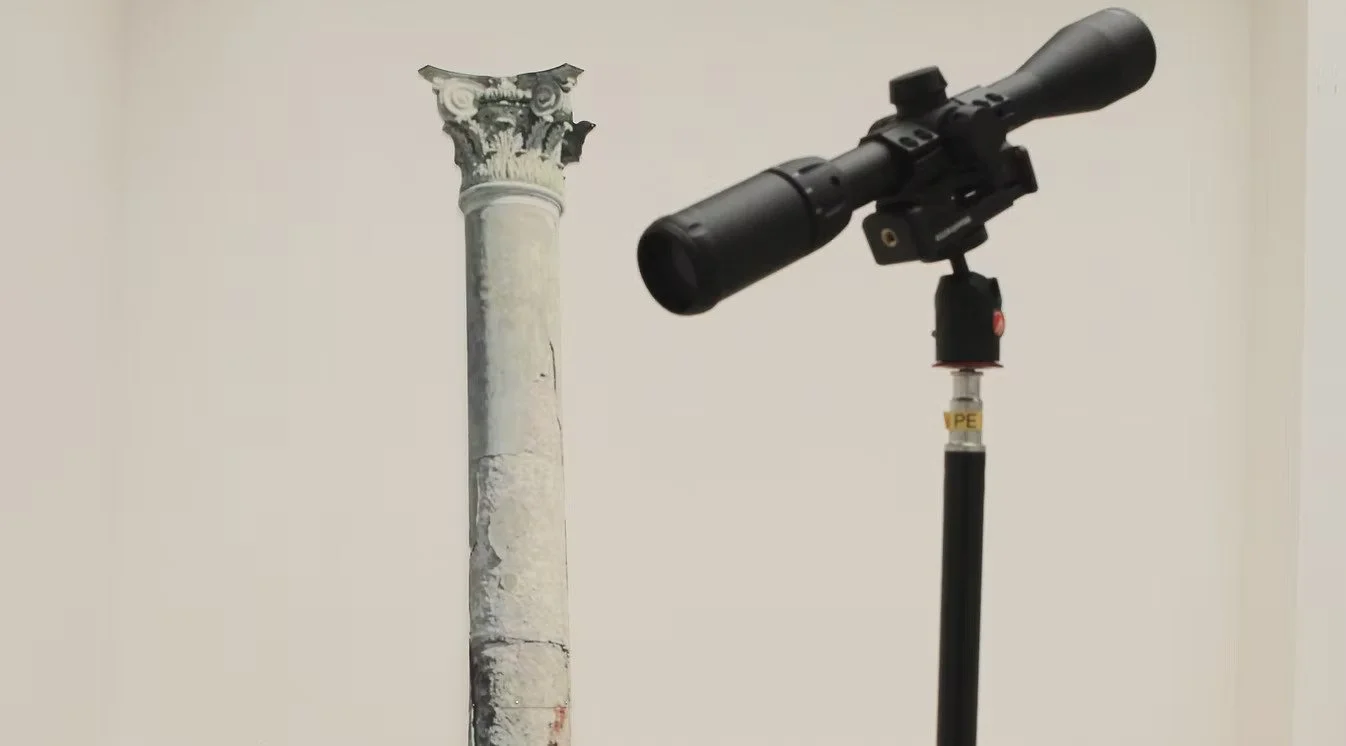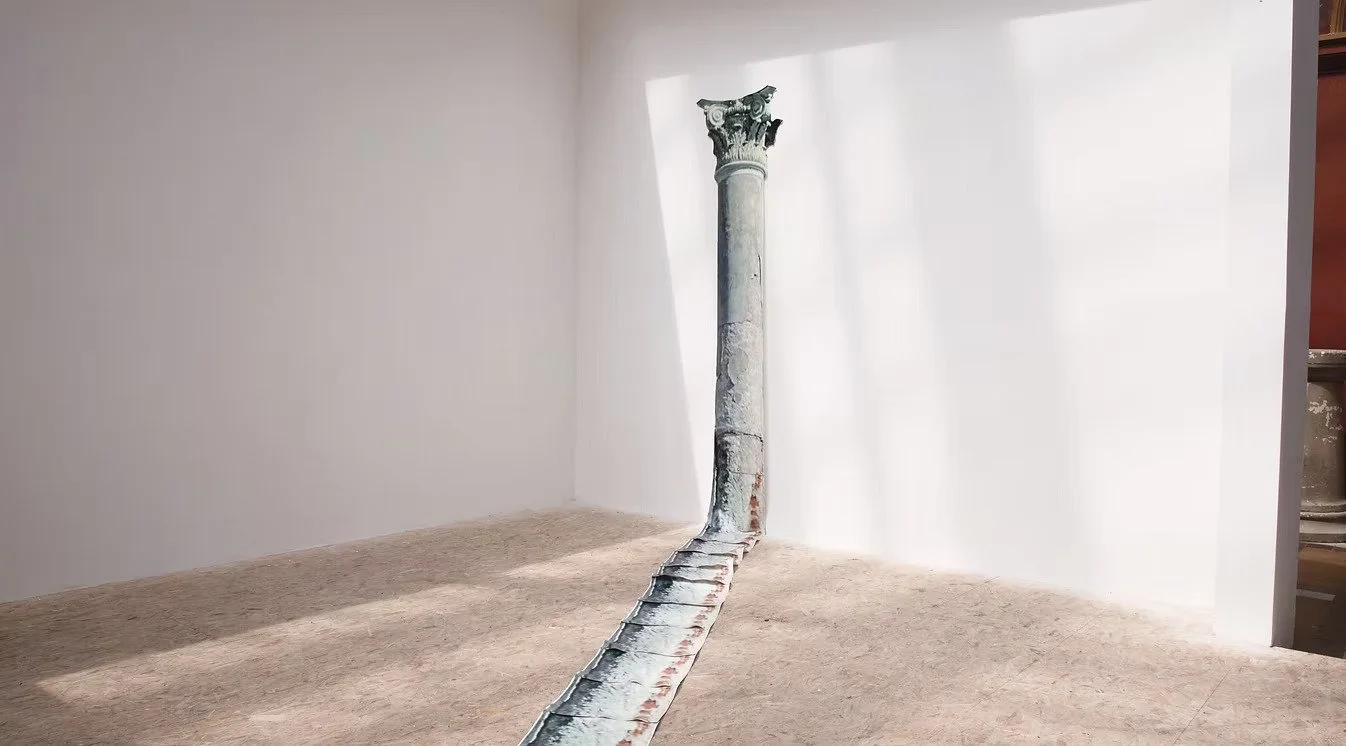 Part of the False Sun research project, the installation sees culture as a hybrid object of transformation of myths, ideologies, disappointed hopes and out-of-context copies bearing the only memory inscribed on their skin. The installation traces a dialogue with existing plaster copies of Discus Thrower (the one who throws the discus) - and his dormant counterpart, Discus Thrower at rest - the one whose action remains potential. It also echoes the giant columns that previously existed here (also copies), which were removed from the main hall as a result of the May 68 revolution in France. Instead, its counterpart was found here from the northernmost point of geographic Europe - Vorkouta, from the ruins of the Palace of Culture; both spaces, although they lie in almost opposite corners of Europe - one from the former USSR, the other from antiquity, where Europe rooted its identity, seem almost as doubles.
