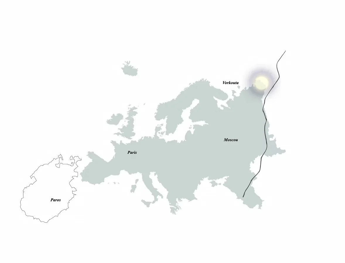 The present document is the result of a research trip by the artist to the city of Vorkuta in Russia - one of the six columns of the Palace of Culture. The city in the North, the easternmost of geographical Europe, Vorkuta is rapidly disappearing. Founded in the 1930s as part of the Gulag system around the coal mines, it has gone from being a concentration camp to a dream city, supported by the architectural discourse - that of the Stalinist empire, echoing the antiquity - to the ruins, still partly inhabited.