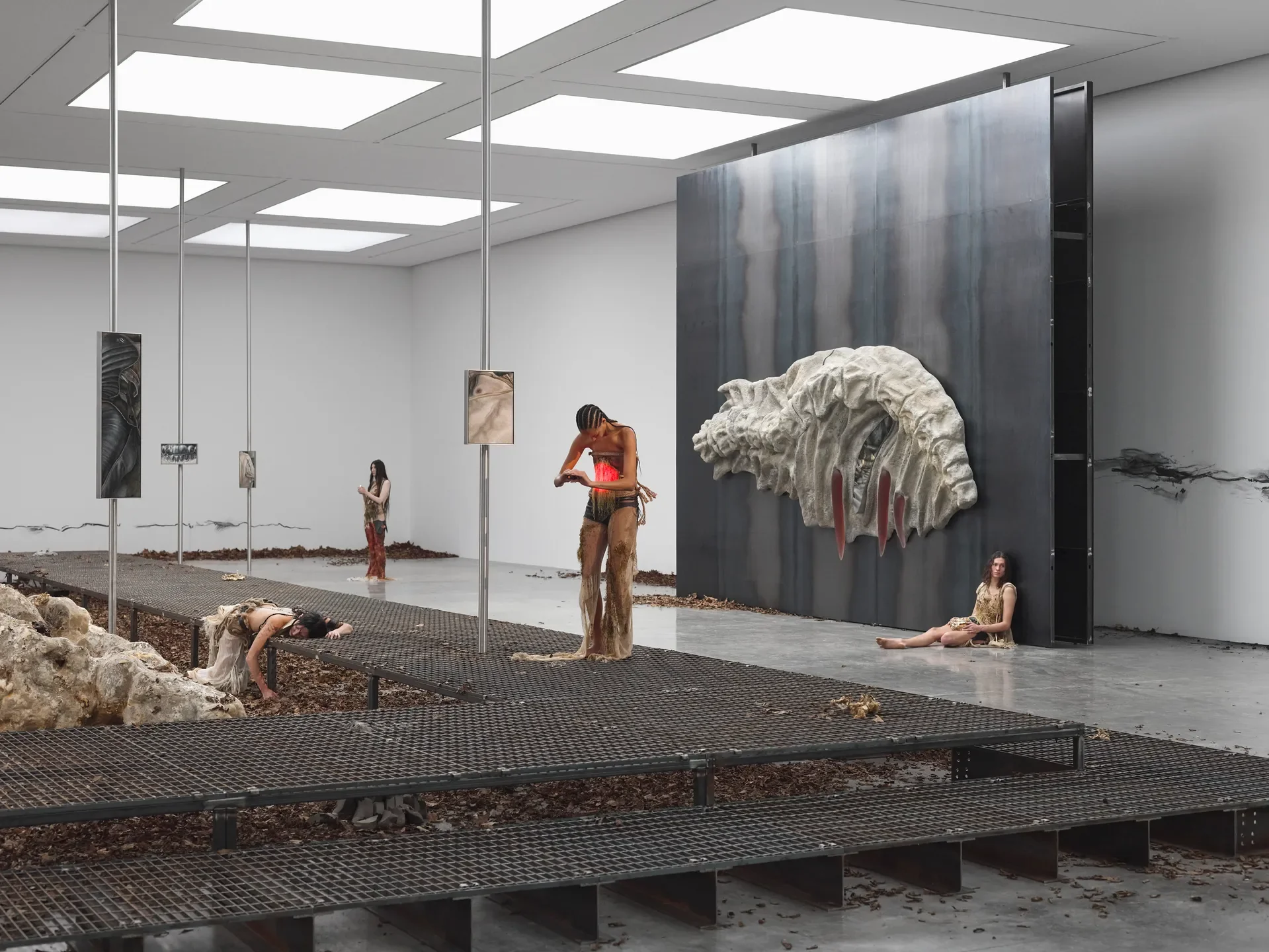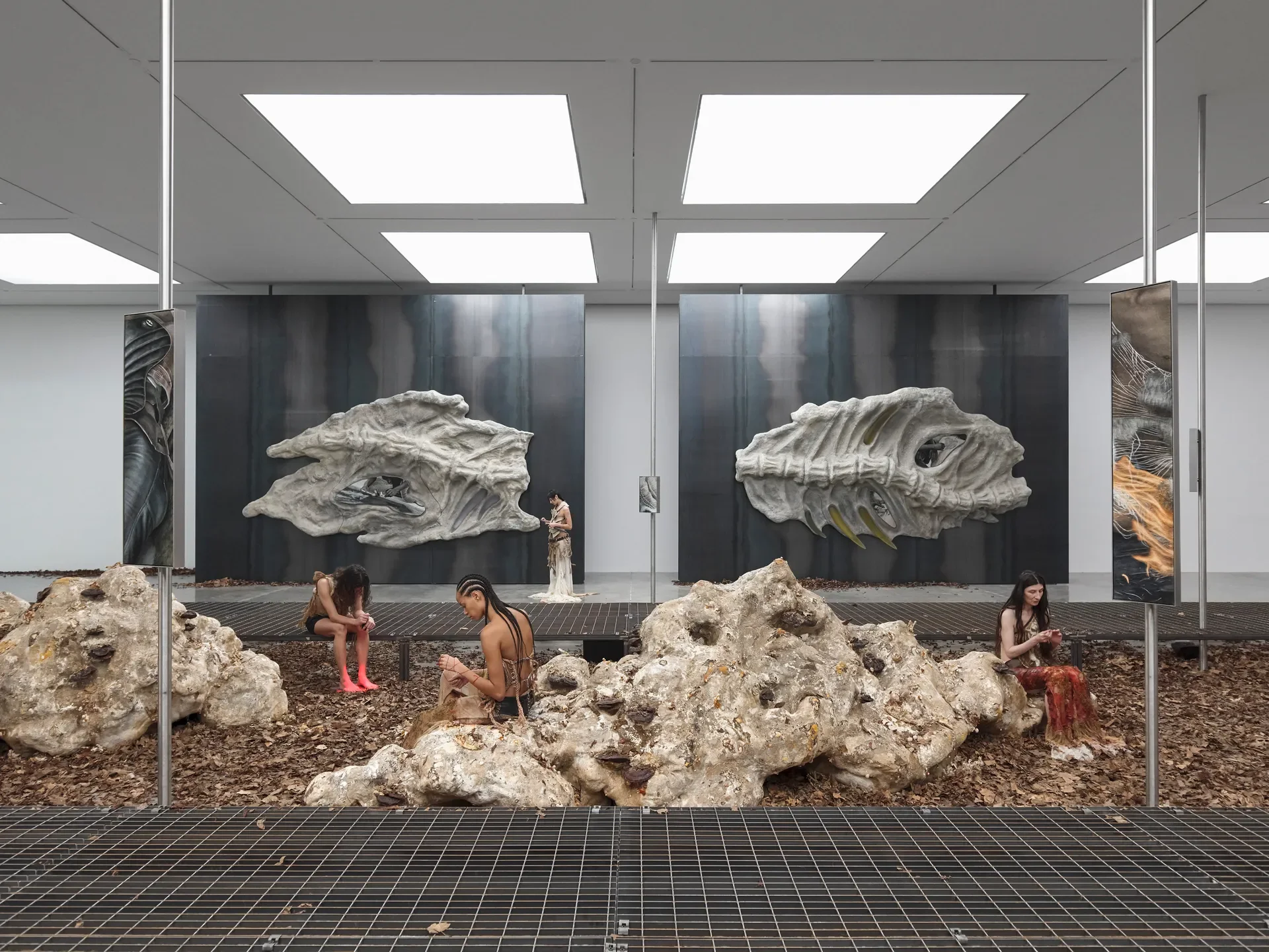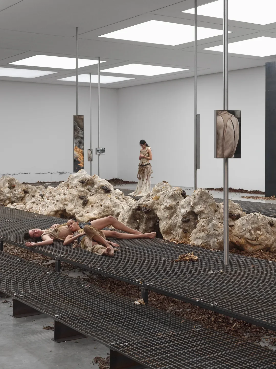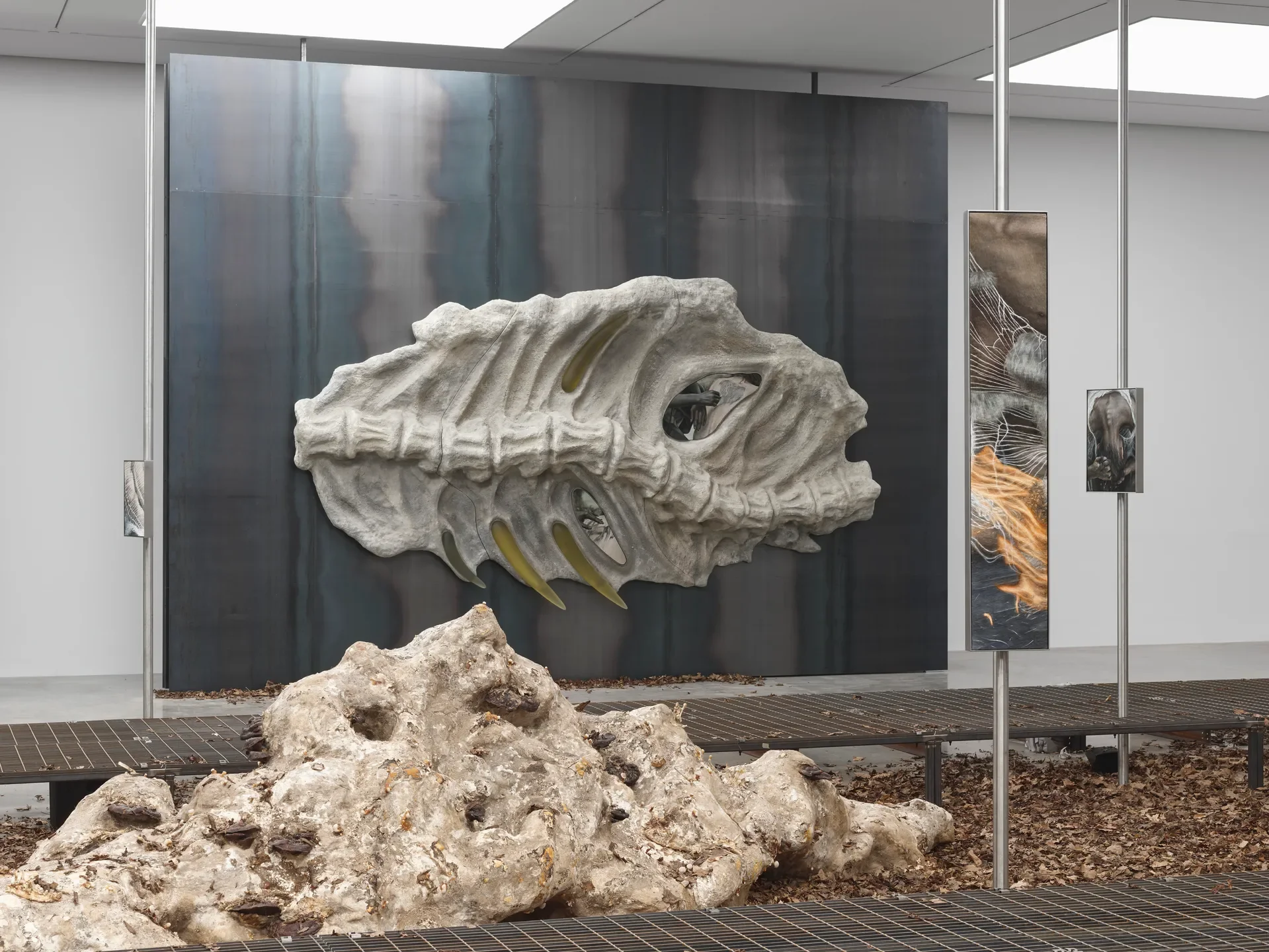 Involving all-encompassing scenographies that take on the gravity and presence of alternative worlds, Klára Hosnedlová’s new exhibition ‘Echo’ is, first and foremost, an extensive meditation on time. Within the capacious, post-industrial chambers of White Cube’s Bermondsey site, sprawling manmade structures appear abandoned to, or overtaken by, massive growths that are organic in kind. Regarding time as iteration and reverberation, Hosnedlová’s constructed environments evoke an archaeological excavation of a future – ‘experimental places’ where time-based processes take root and play out.