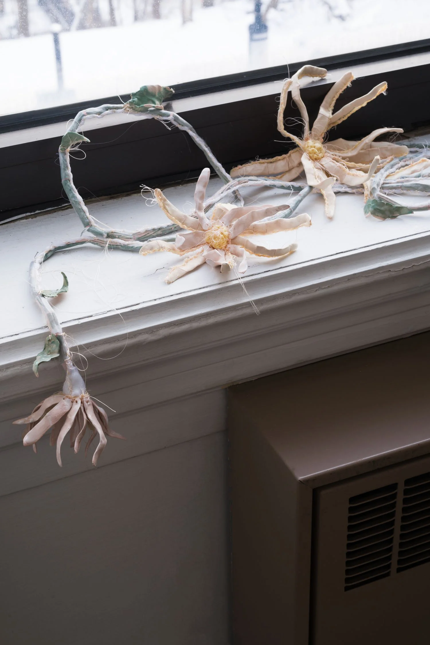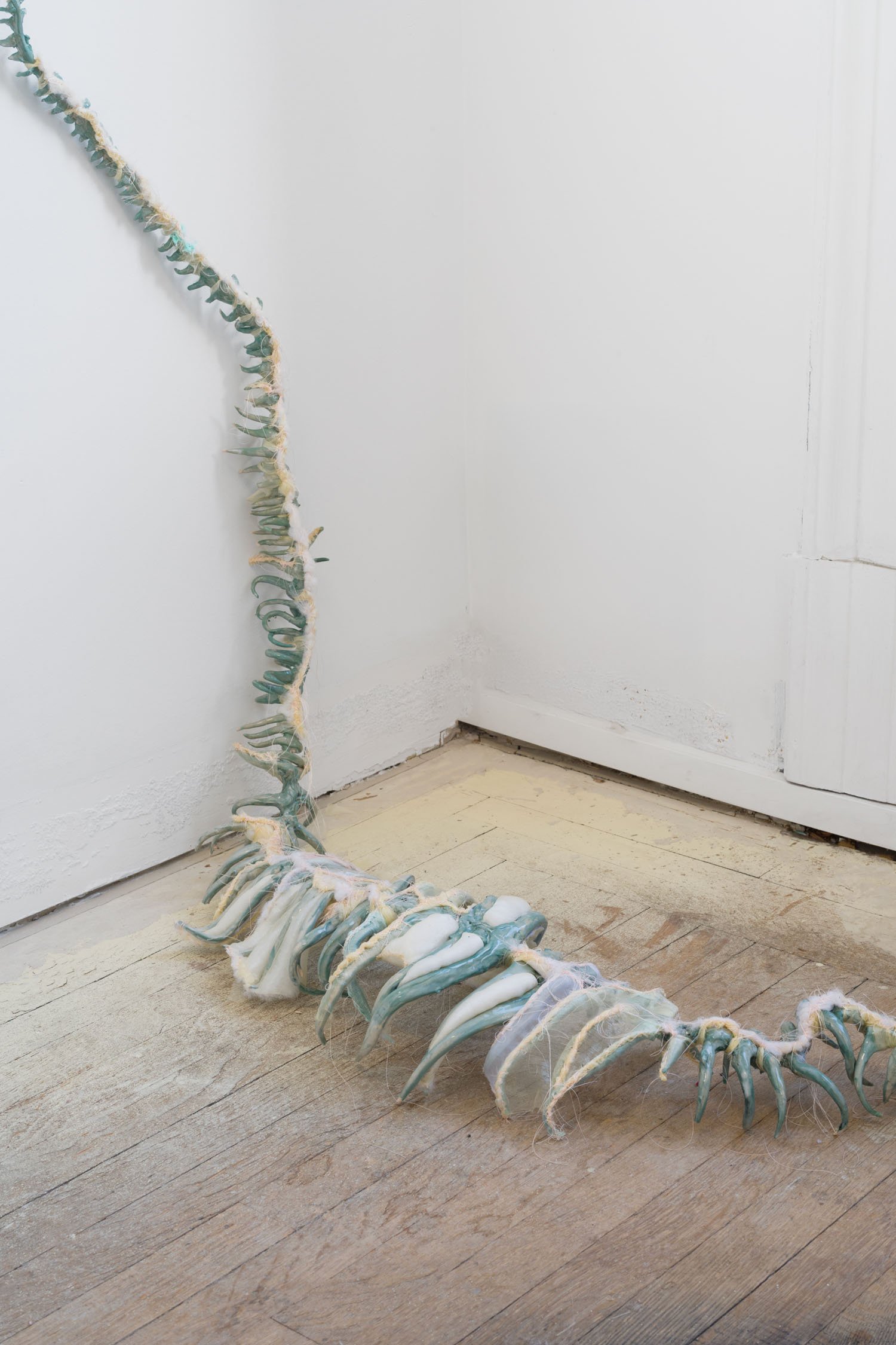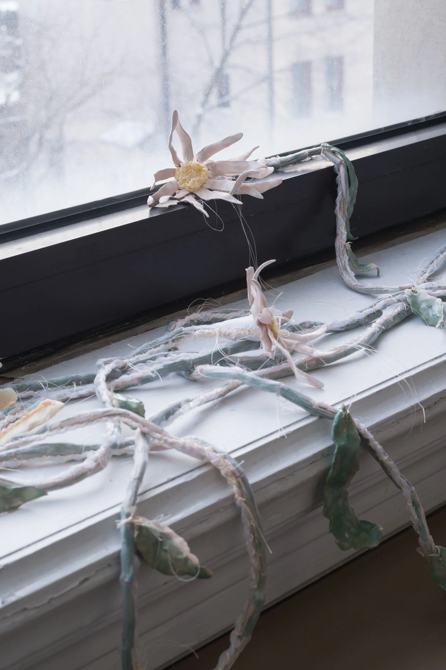 In her dream, her stomach turns into a ceramic flower stem. The growing plant’s pieces are falling apart. Lying in her bed, she tries to stitch the fragments of her belly back together, like she does in the studio while building her giant flowers. It happens often in her dreams that she’s overwhelmed by her work, by the mountain of work ahead. Her sheets turn into a fabric that envelops her, swallowing her.