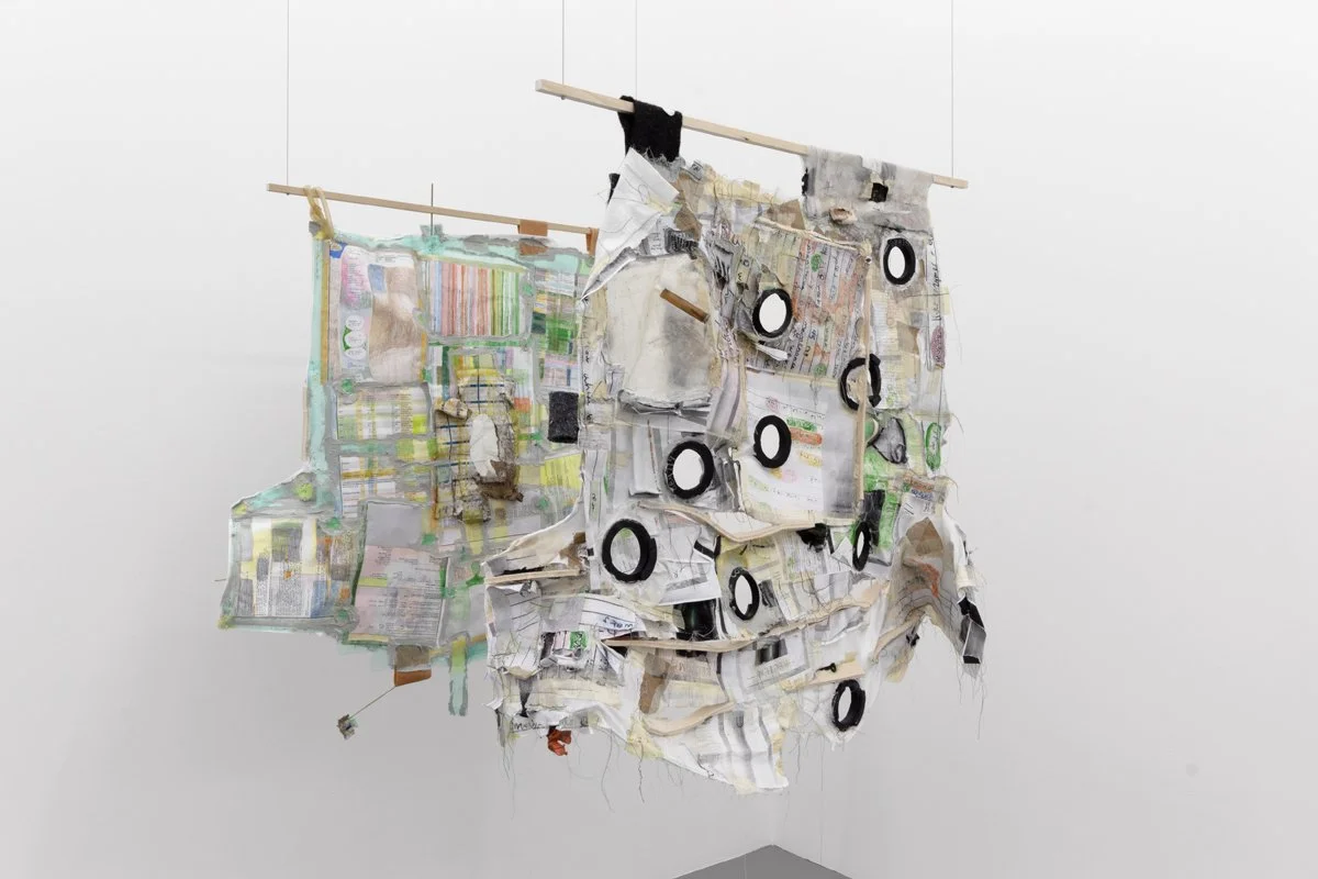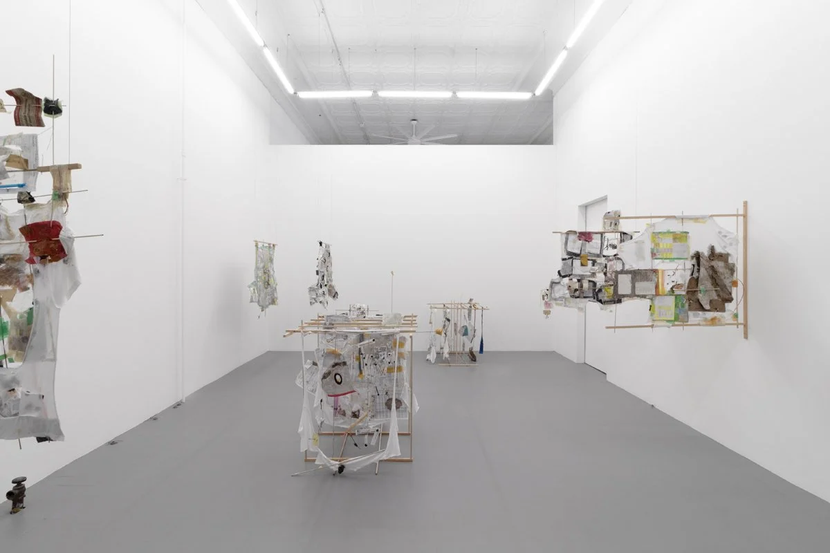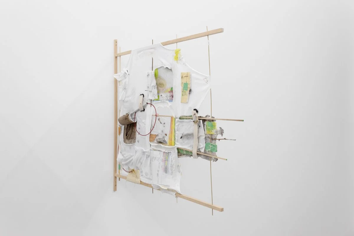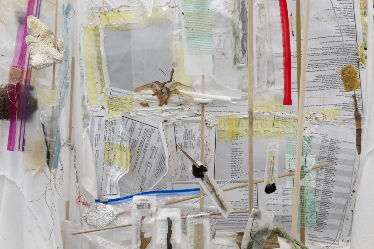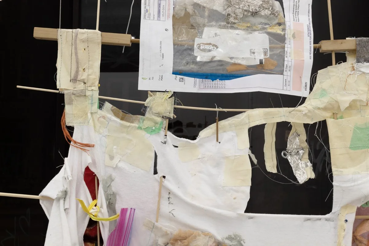 hardwood dowels, cotton t-shirts, masking tape, drywall tape, silicon caulk, wood glue, thread, embroidery thread, quilting pins, steel wire, ziplock bags, wood dust, silicon rubber plumbing gaskets, fiberglass insulation, lint, sticks, Ricola wrappers, printer paper, toner, colored pencil, USB cable, headphone cable, run over water bottle, grass + flowers with primer paint from mural, twist tie, eroded envelopes, Takeda envelope, Aetna envelope, envelope fragment, cardboard fragment, latex rubber tubing, PVC rubber tube, cicadashell