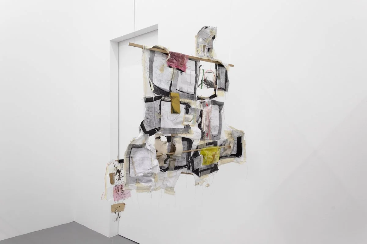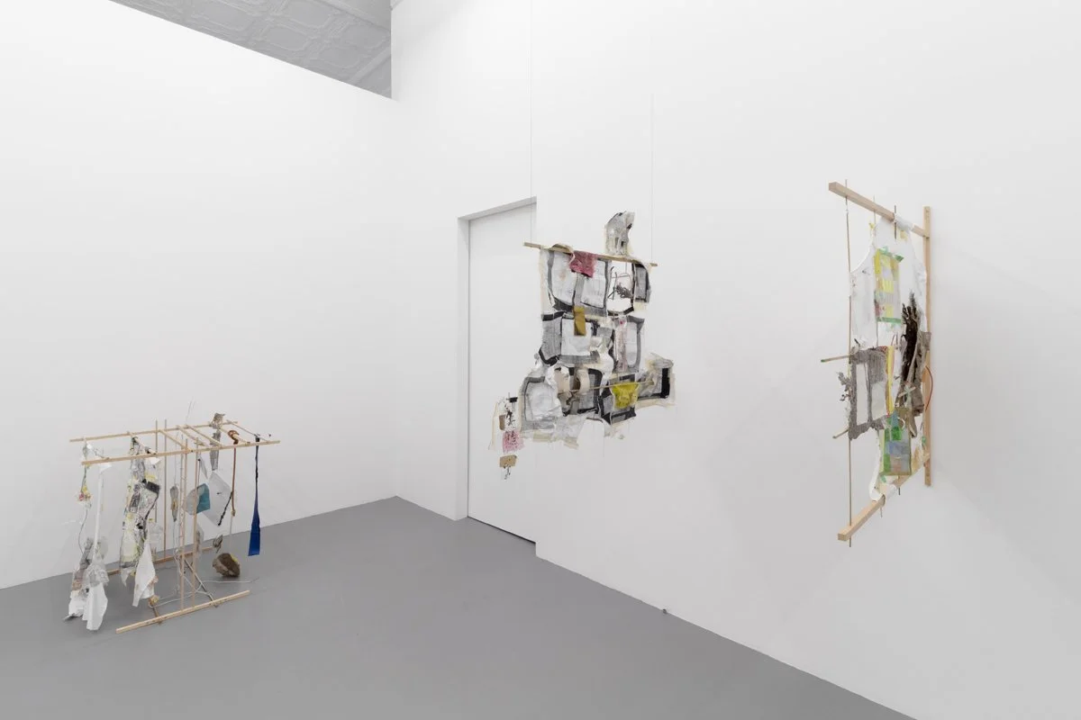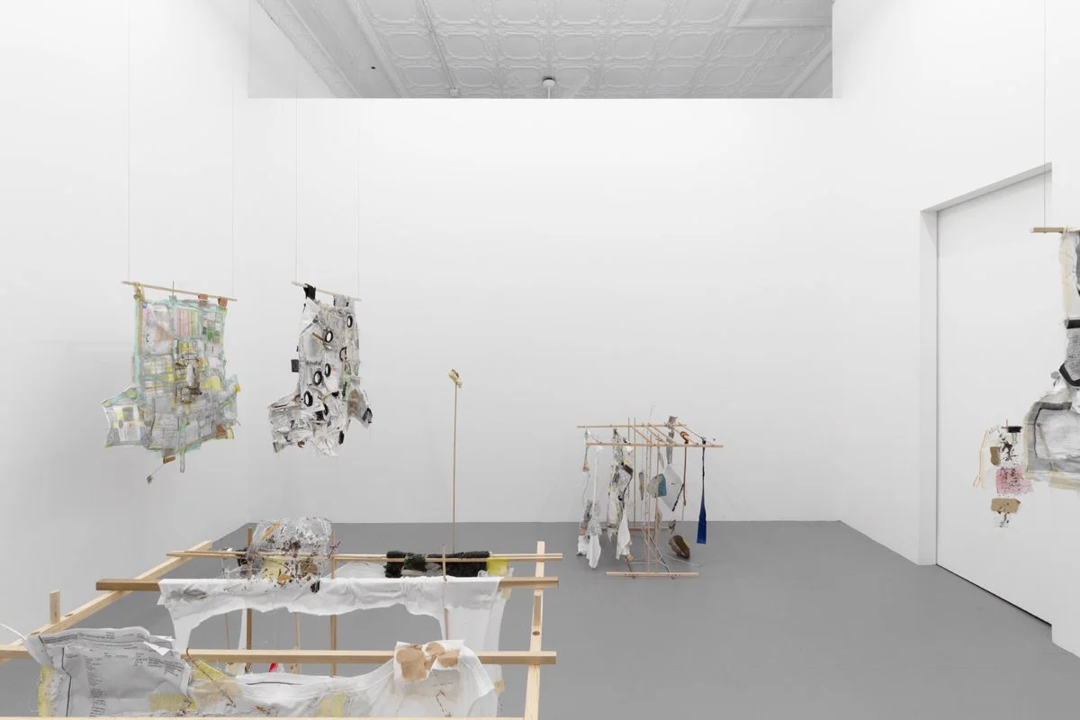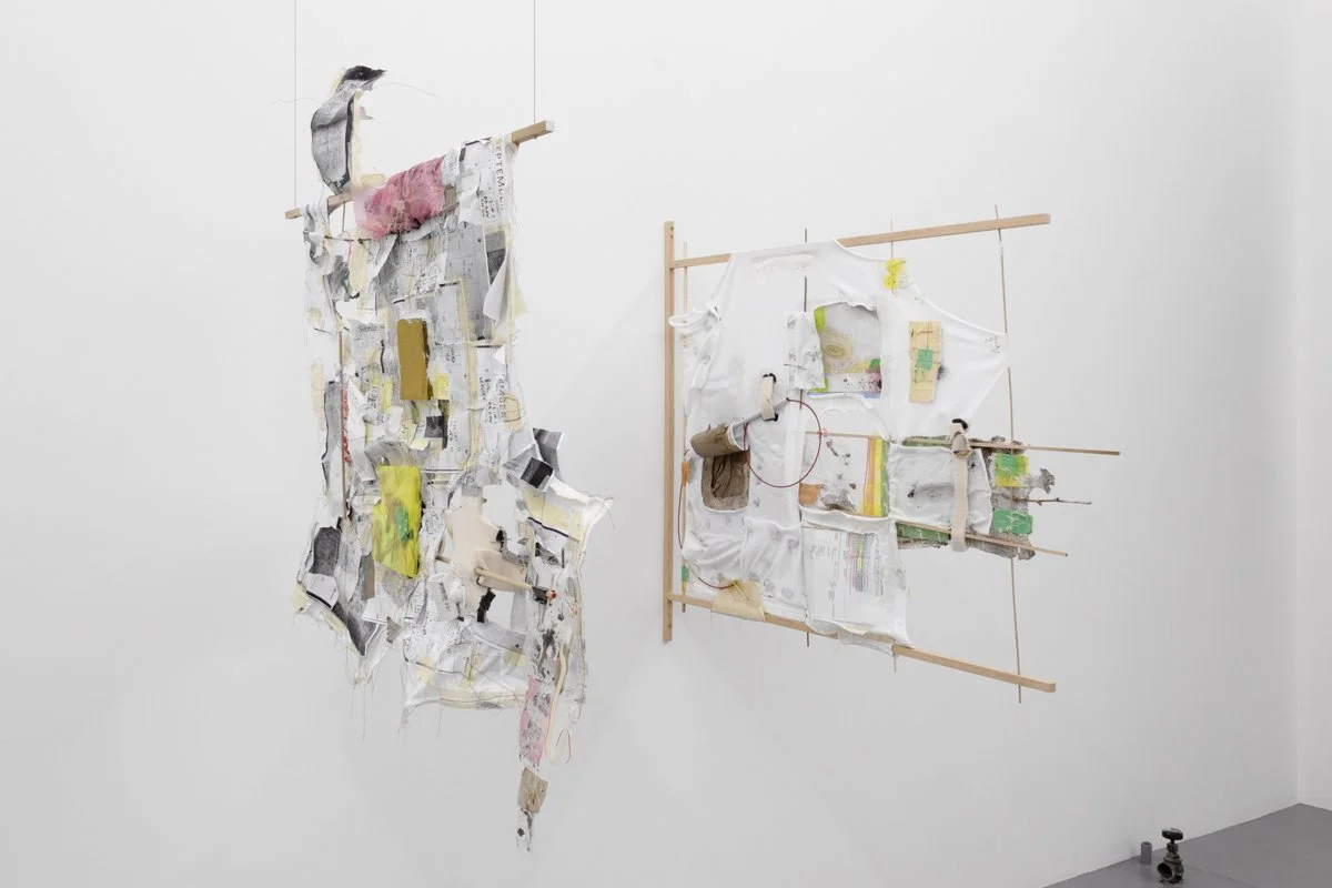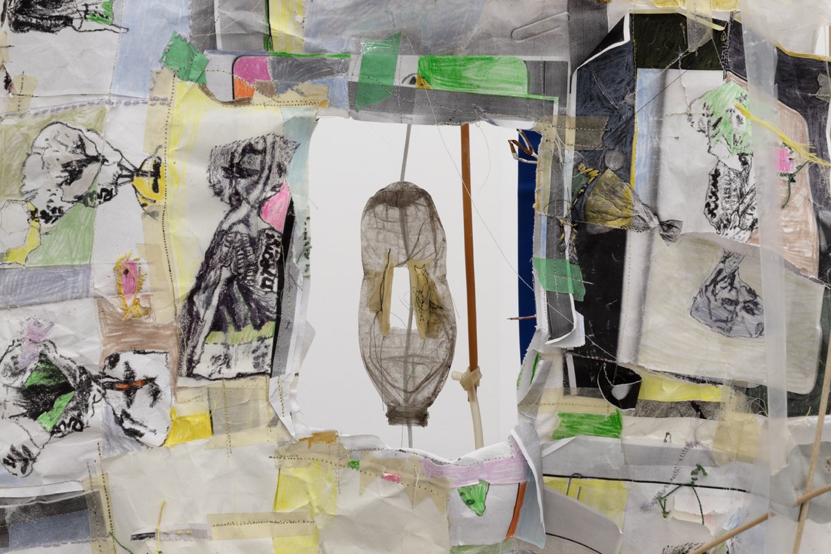 hardwood dowels, cotton t-shirts, masking tape, drywall tape, silicon caulk, wood glue, thread, embroidery thread, quilting pins, steel wire, ziplock bags, wood dust, silicon rubber plumbing gaskets, fiberglass insulation, lint, sticks, Ricola wrappers, printer paper, toner, colored pencil, USB cable, headphone cable, run over water bottle, grass + flowers with primer paint from mural, twist tie, eroded envelopes, Takeda envelope, Aetna envelope, envelope fragment, cardboard fragment, latex rubber tubing, PVC rubber tube, cicadashell
