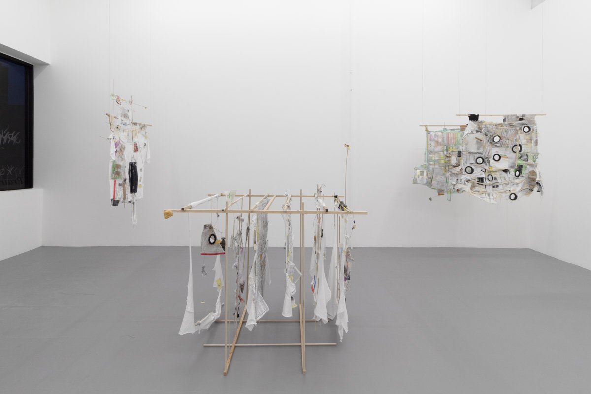 hardwood dowels, cotton t-shirts, masking tape, packing tape, drywall tape, electrical tape, silicon caulk, thread, quilting pins, steel wire, ziplock bags, ginkgo leaves, other leaves, sticks, string, needle wrappers, syringe wrappers, suppository wrapper, suppository inserters, clothespin, foam fragments, plastic fragments, feather, paper scraps, printer paper, eroded paper, paper towel, toner, journal paper, pen, colored pencil, aluminum foil remnants, found band-aid, silicon rubber plumbing gaskets with silver paint marker, rubber cable, volcanic rock