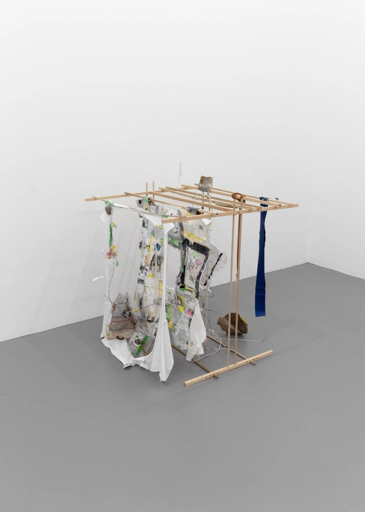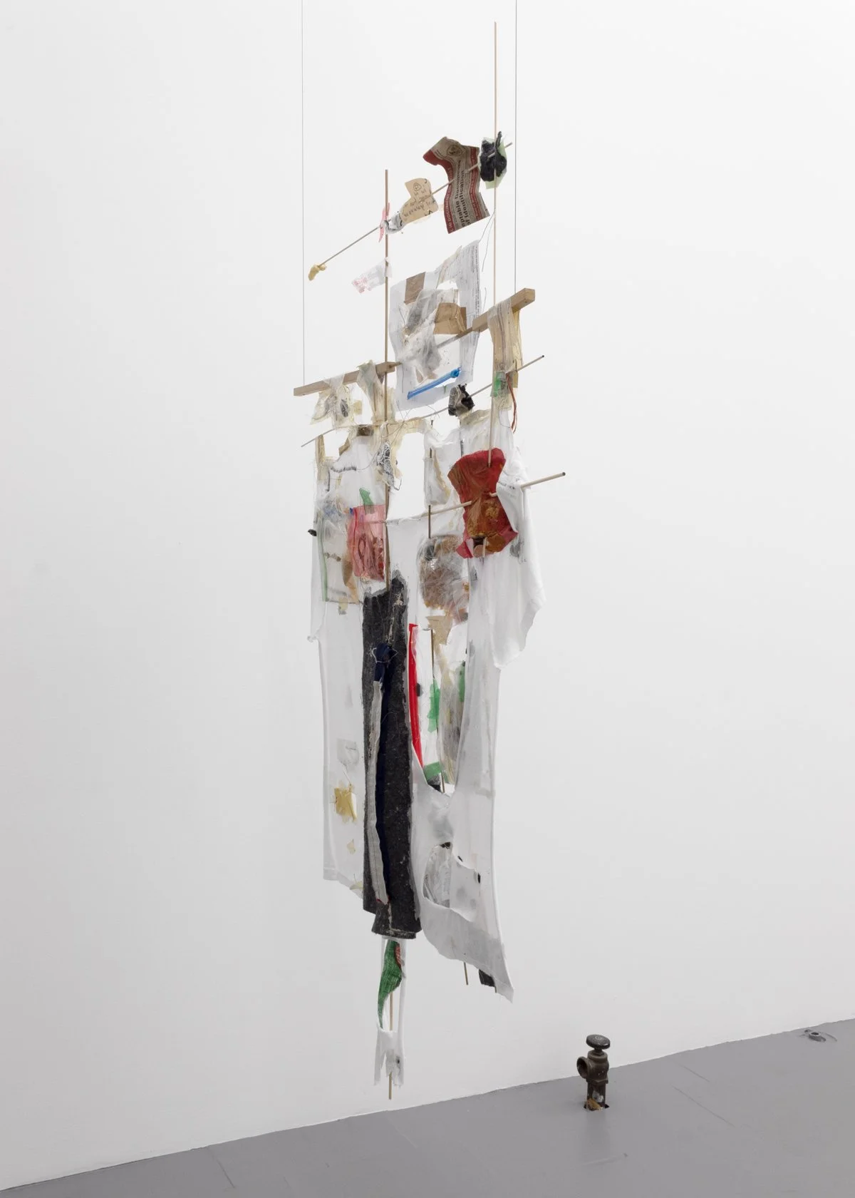 cotton t-shirt, hardwood dowels, masking tape, drywall tape, latex rubber tubing, silicon caulk, thread, quilting pins, printer paper, toner, colored pencil, run-over and eroded tissue box and fragments, eroding crayon drawing fragment, plastic pouch, car air-freshener fragment, die-cast-end steel cables