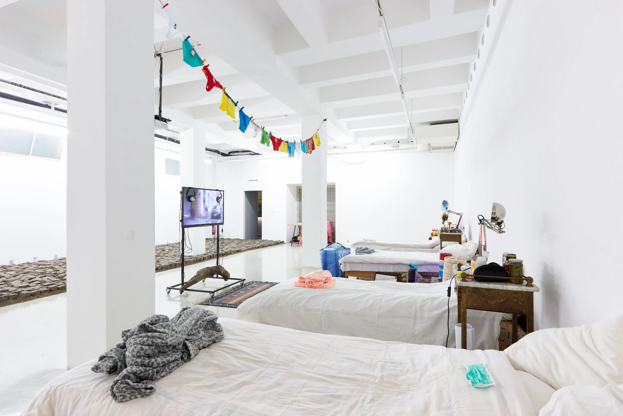 At the exhibition entitled Postapocapitalist, one can read ideas for non-realisable artworks, critical proclamations and post-conceptual statements selected from hundreds of fully-scribbled notebooks from the past twenty years, displayed in various forms (running on LED boards, scratched on aluminium foil or even written on cobblestones). These sometimes funny, sometimes philosophical sentences can also be considered as either pieces of life coaching advices or starting points for spiritual practices. Together with these sentences and ideas, the artist himself moves into the gallery space for the duration of the exhibition. Visitors of the exhibition and/or of the artist who is recovering from pneumonia can even make themselves at home, lie on one of the ward beds of this sanatorium and exchange further ideas with Mécs. Visiting hours are not limited!