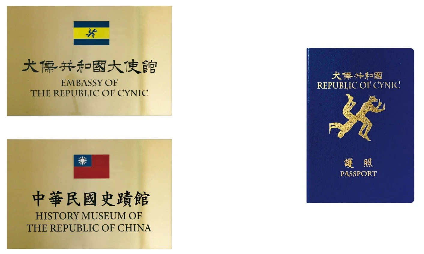 Yao Jui-Chung: Republic of Cynic (R.O.C.). Left page: The Embassy of the Republic of Cynic signboard (top) / History Museum of the Republic of China signboard (bottom). Right page: The Republic of Cynic passport