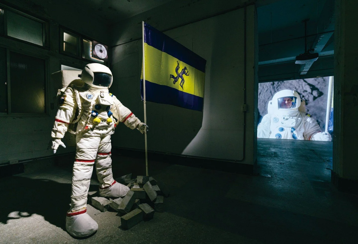 As an artistic practice of “the state within a state,” Republic of Cynic not only introduces an imaginary national identification system (incl. national emblem, national flag, costumes and slogans), but also repurposes two buildings of the former Air Force Command Headquarters for the specific sites of this project. The Art Space V (former U.S. Aid Building) serves as the main venue and conceptually becomes the “Embassy of the Republic of Cynic in the Republic of China,” hosting four newly commissioned video installation works inspired by the historic events that affected the entangled U.S.-China-Taiwan relations, including the Moon landing, anti-American protests, the Tiananmen Square protests, and the September 11 attacks. By reference to Yao’s image system since the 1990s, this main venue also features the juxtaposition of his earlier works and massive manuscripts and archives from the “propeller man” motif and the work series of Book of Chrysanthemum to Beyond the Blue Sky and Beyond the Human Being that are eventually linked to the theme of “cynic.”