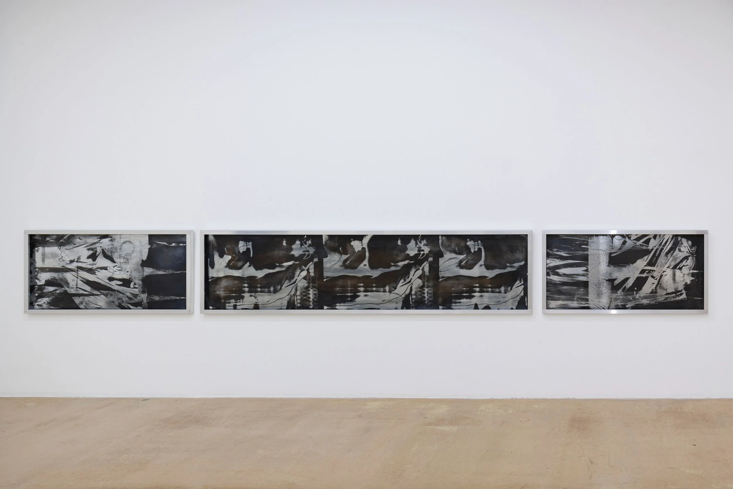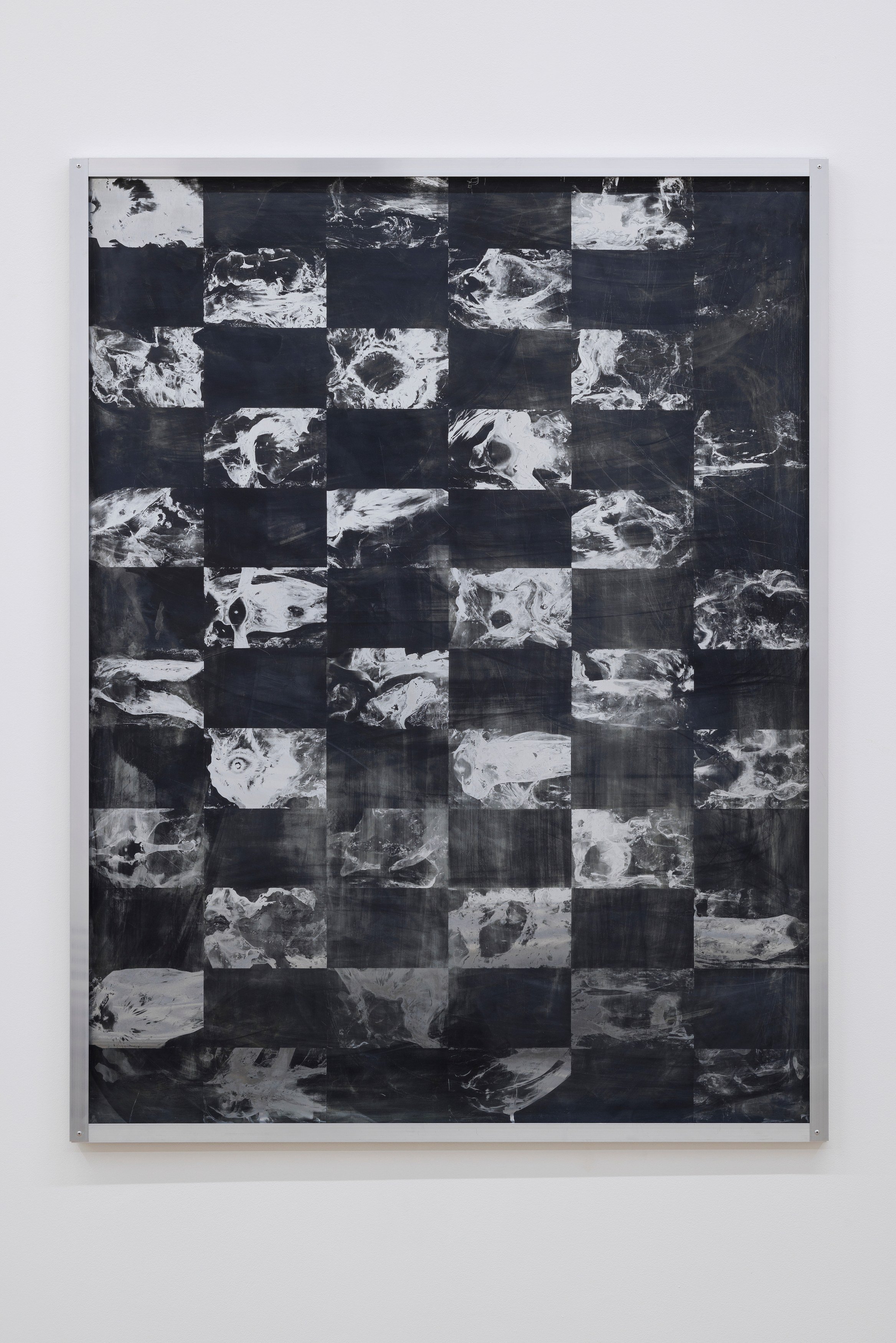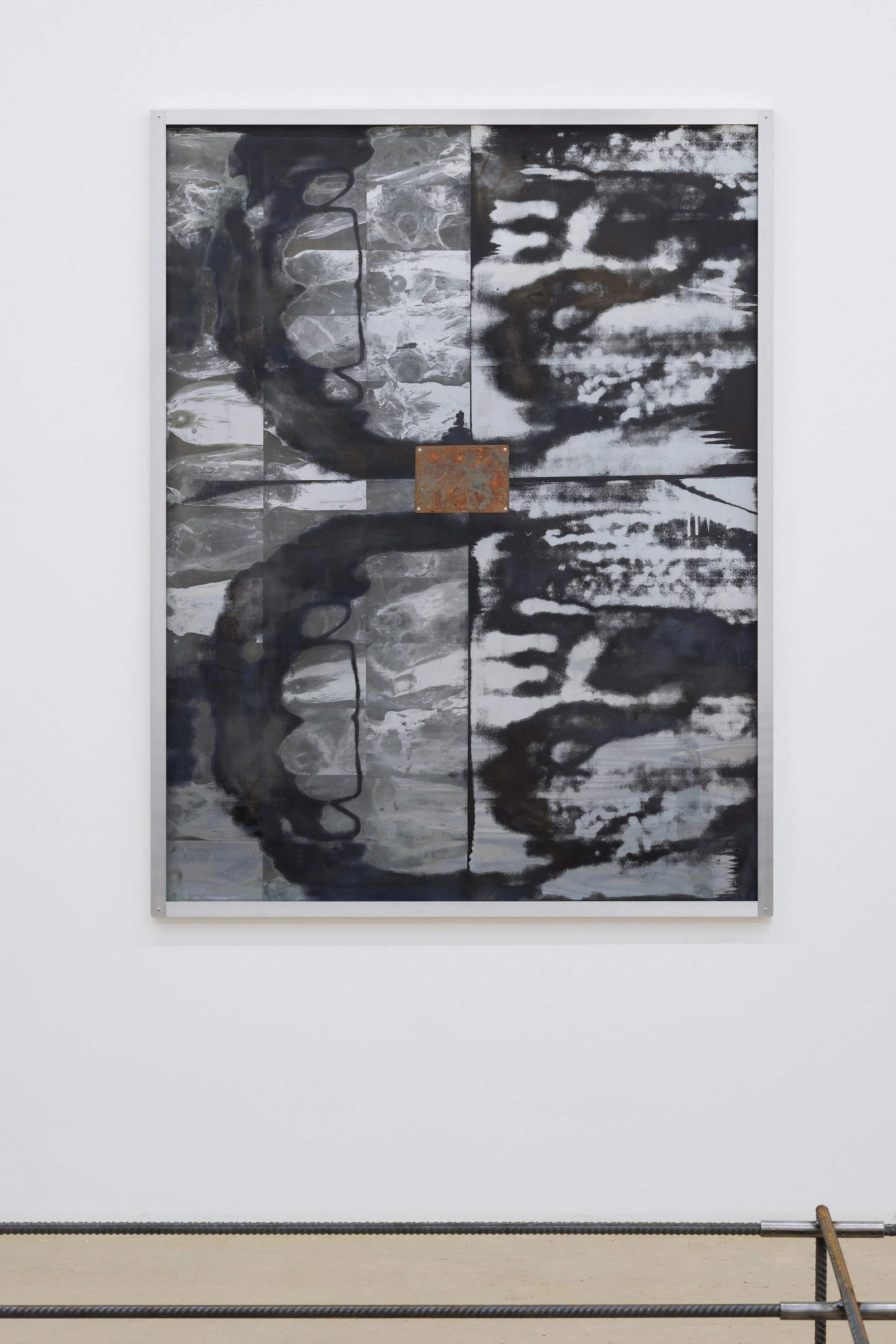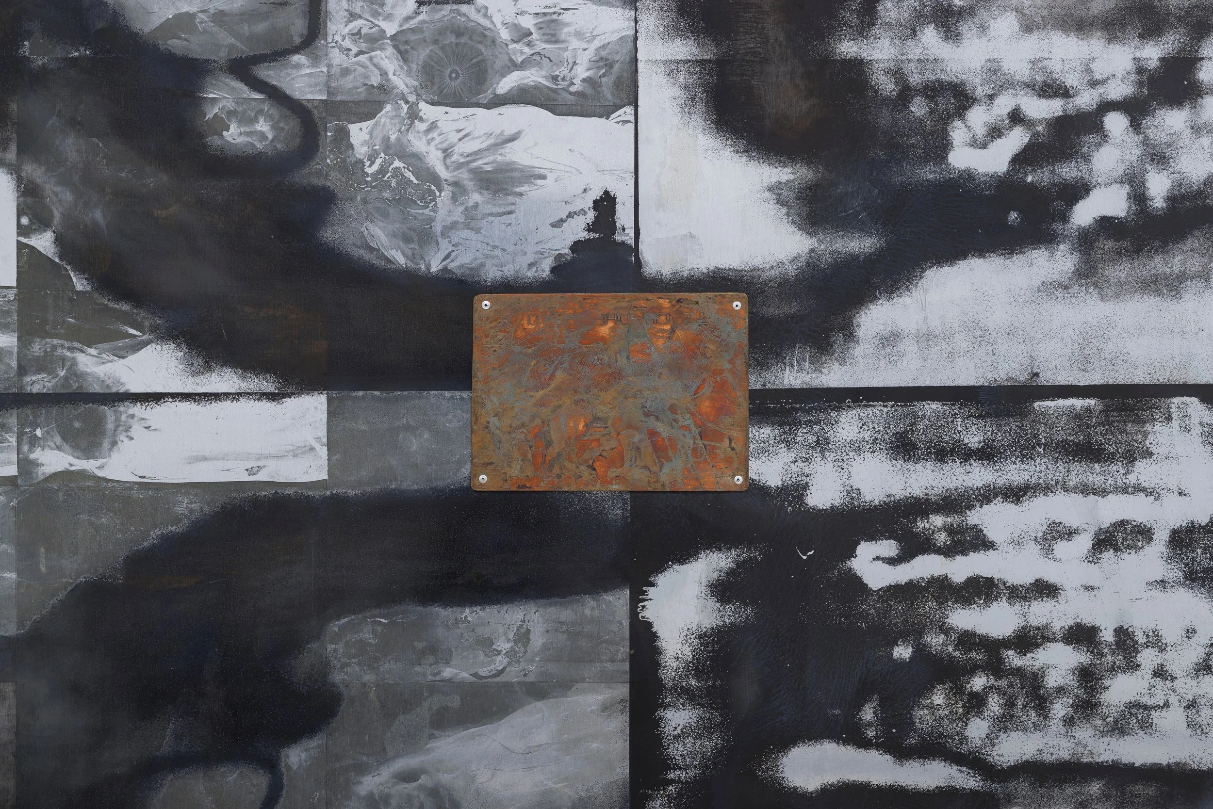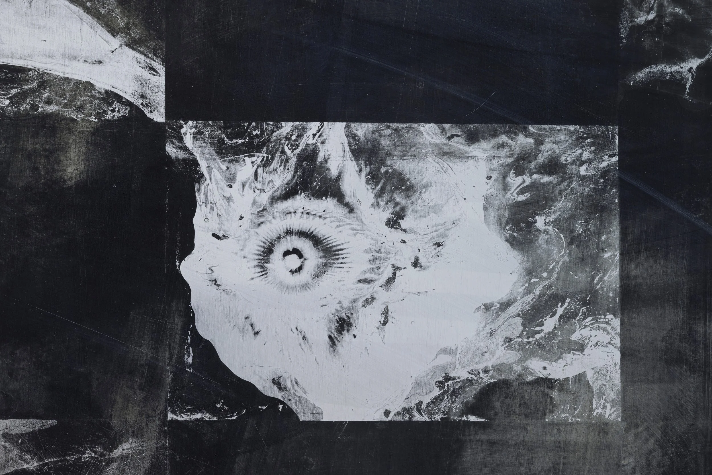 The state of the zinc and copper plates onto which existing images are screen-printed, etched and spat on with various acids is also liquid. First as metals, since they are meltable. Secondly because, as printing plates, they are both the source of the image without being the image, and thus discardable. That Sosunova plays with the very ambiguous state of the matrix—the technical printing term designating the plate — as a surface for display (here emphasised when placed behind a vitrine or framed) is not innocent. In doing so, she highlights the “origin of the image” and speaks to the history of image production and its circulation. The inclusion of ancient imagery such as Peter van der Brocht’s *Typus Praefecturae* (1578) also serves as a transhistorical portal, one that helps Sosunova write the history of the medium she uses “in its flesh.”