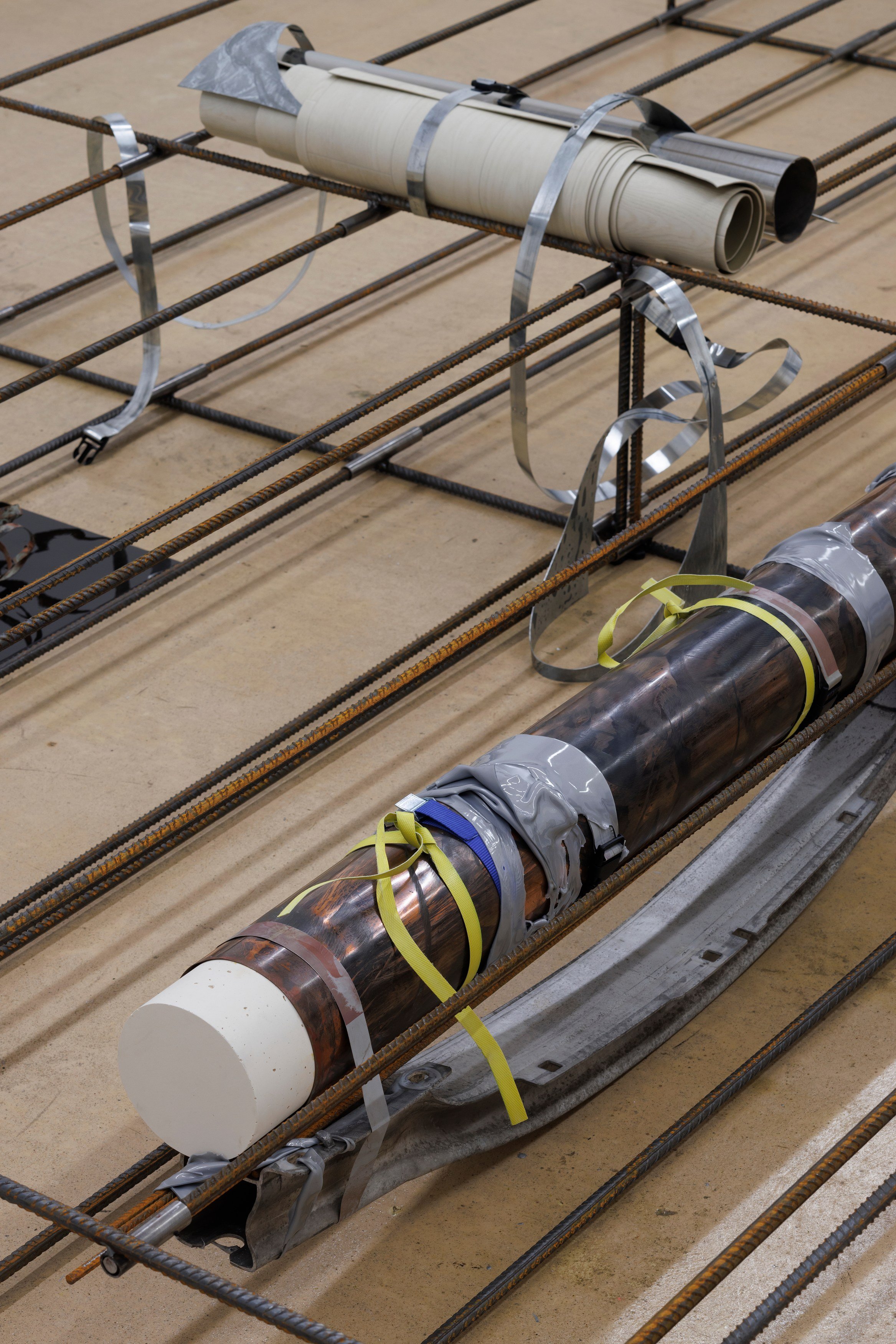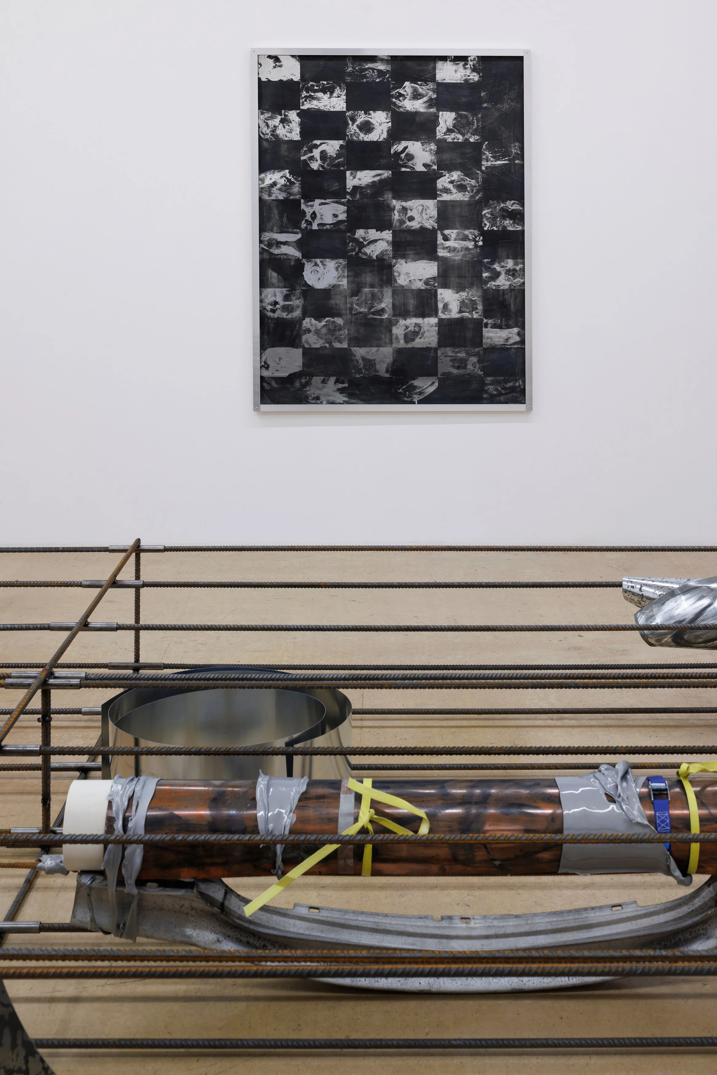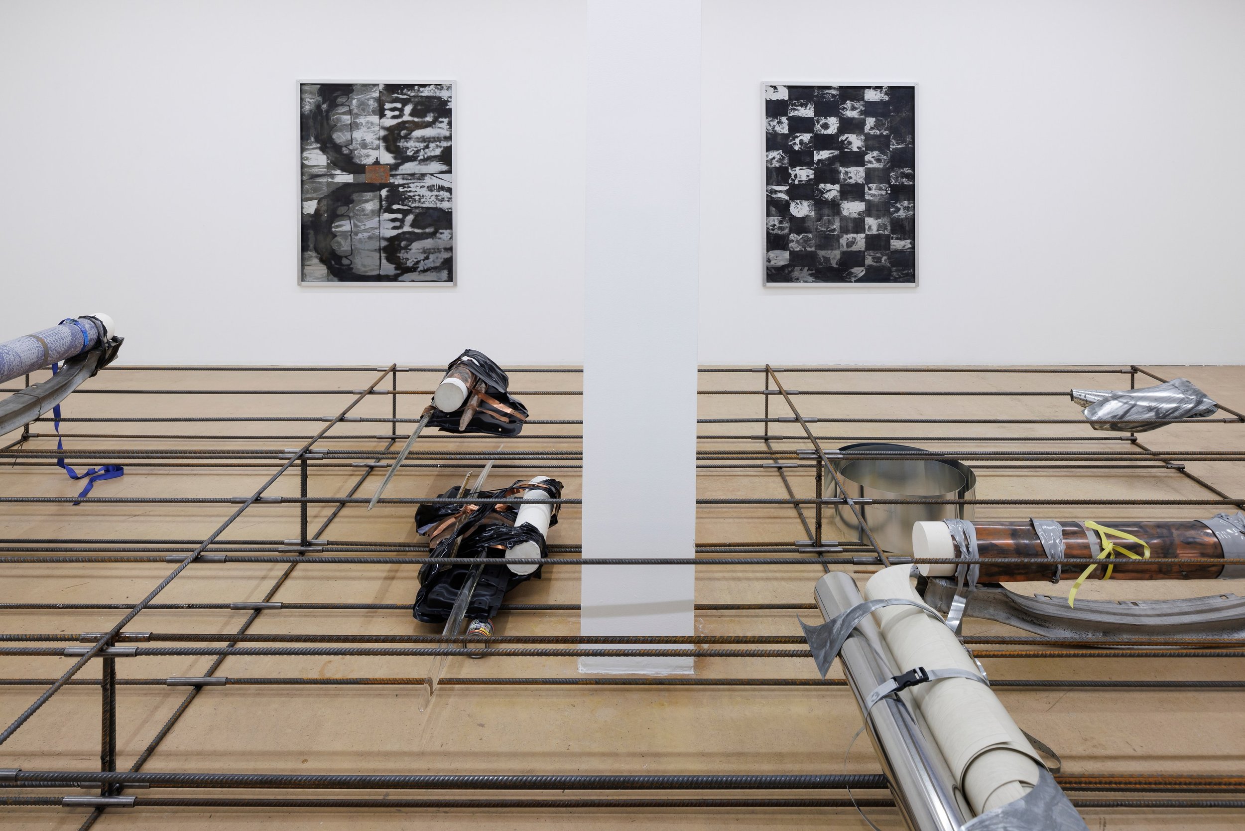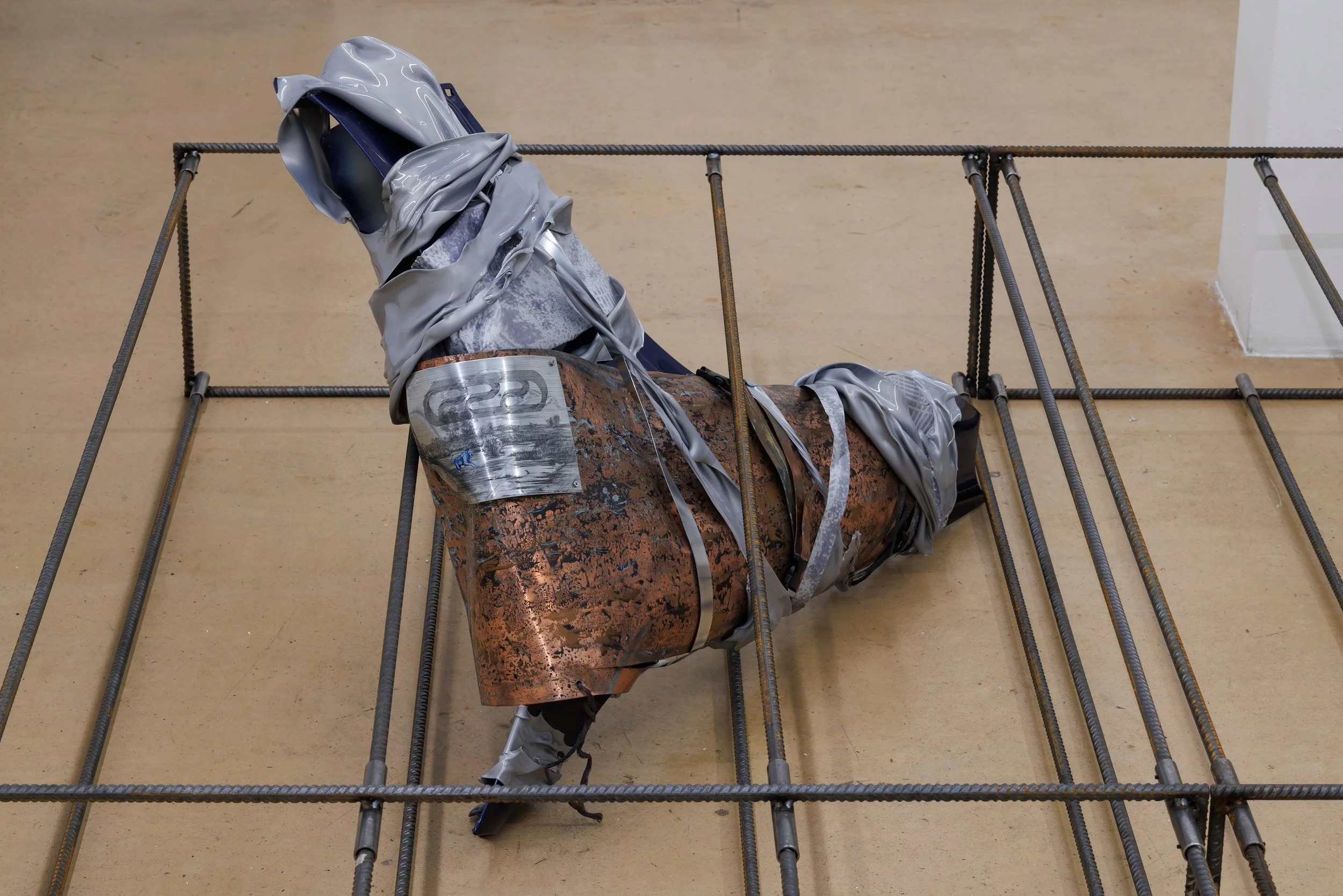 What does Anastasia Sosunova want us to see? For her solo exhibition “Spit Bite” at Kim?, the Lithuanian artist born post-independence (1993) gathers three distinct bodies of work: a series of three videos — shown together for the first time — which could form a trilogy of sorts [DIY (2023), Preyer (2024) and Xover (2025)]; a group of sculptures displayed through a grid-like structure made of rebars [Local Beasts (2024)]; as well as eight new works on metal plates. If their relationships might not come across as obvious at the outset, they are more incestuous than they appear.
