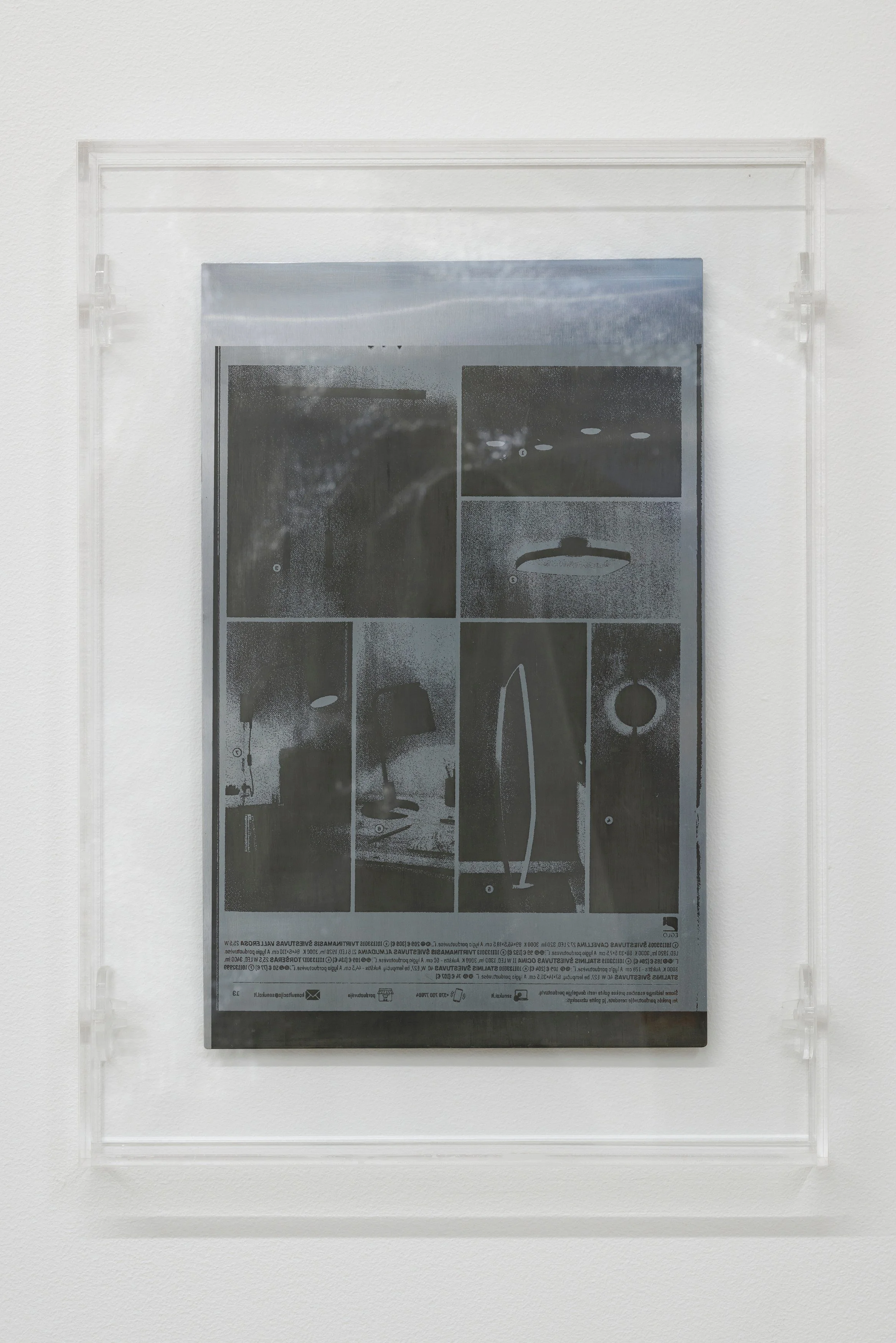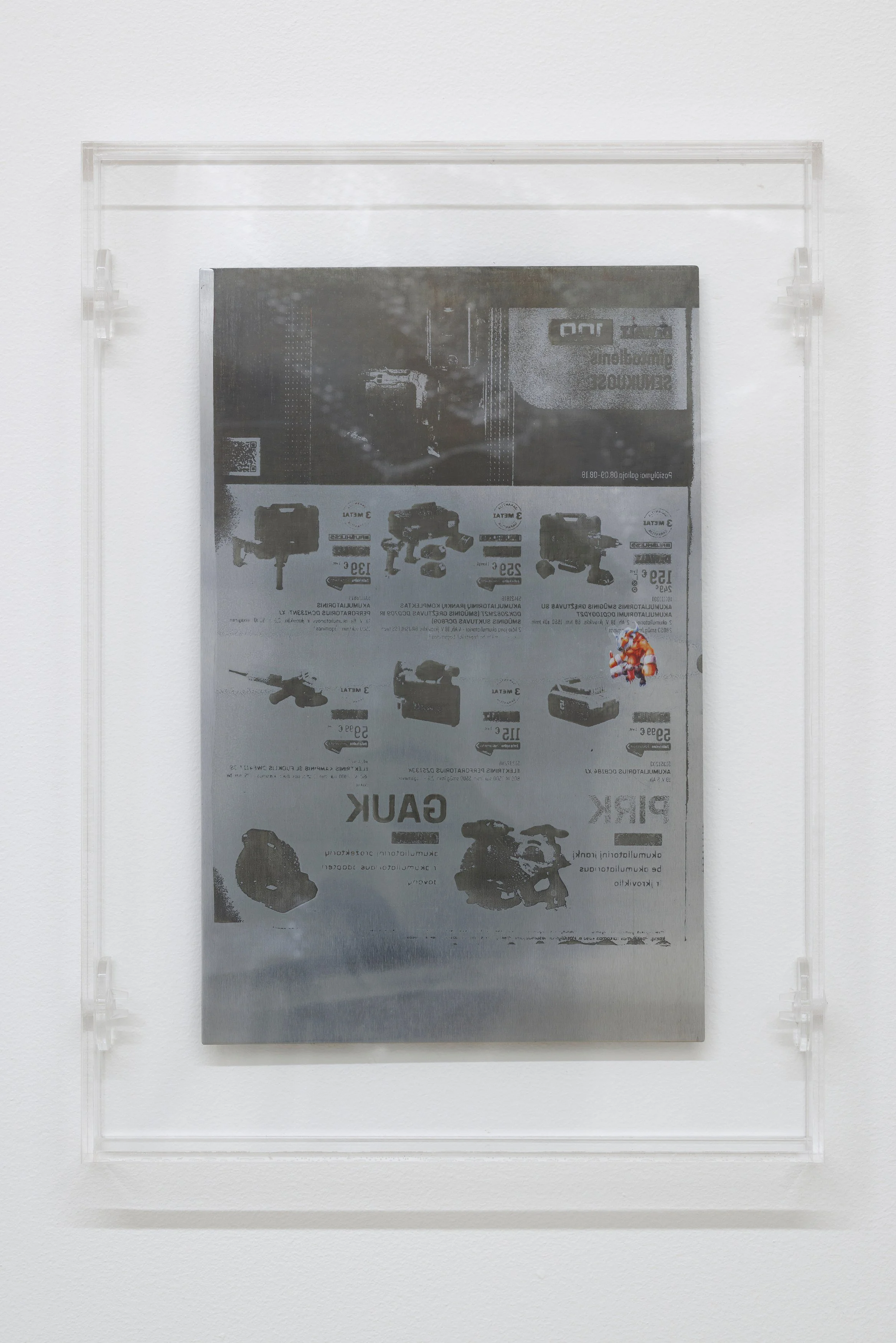 For once, some of the metal sheets — the largest ones — have been screen-printed with stills excerpted from footage and outtakes from the videos on view. Other sheets — the smaller pieces — present pages of catalogues from the Senukai retail chain (the subject matter or starting point of the videos). The same sheets hung on the walls (flat) are also treated sculpturally (rolled up) in Local Beasts, and animal motifs run through both. These echoes and easter eggs point towards the liquid state of signs, images, and what holds them.