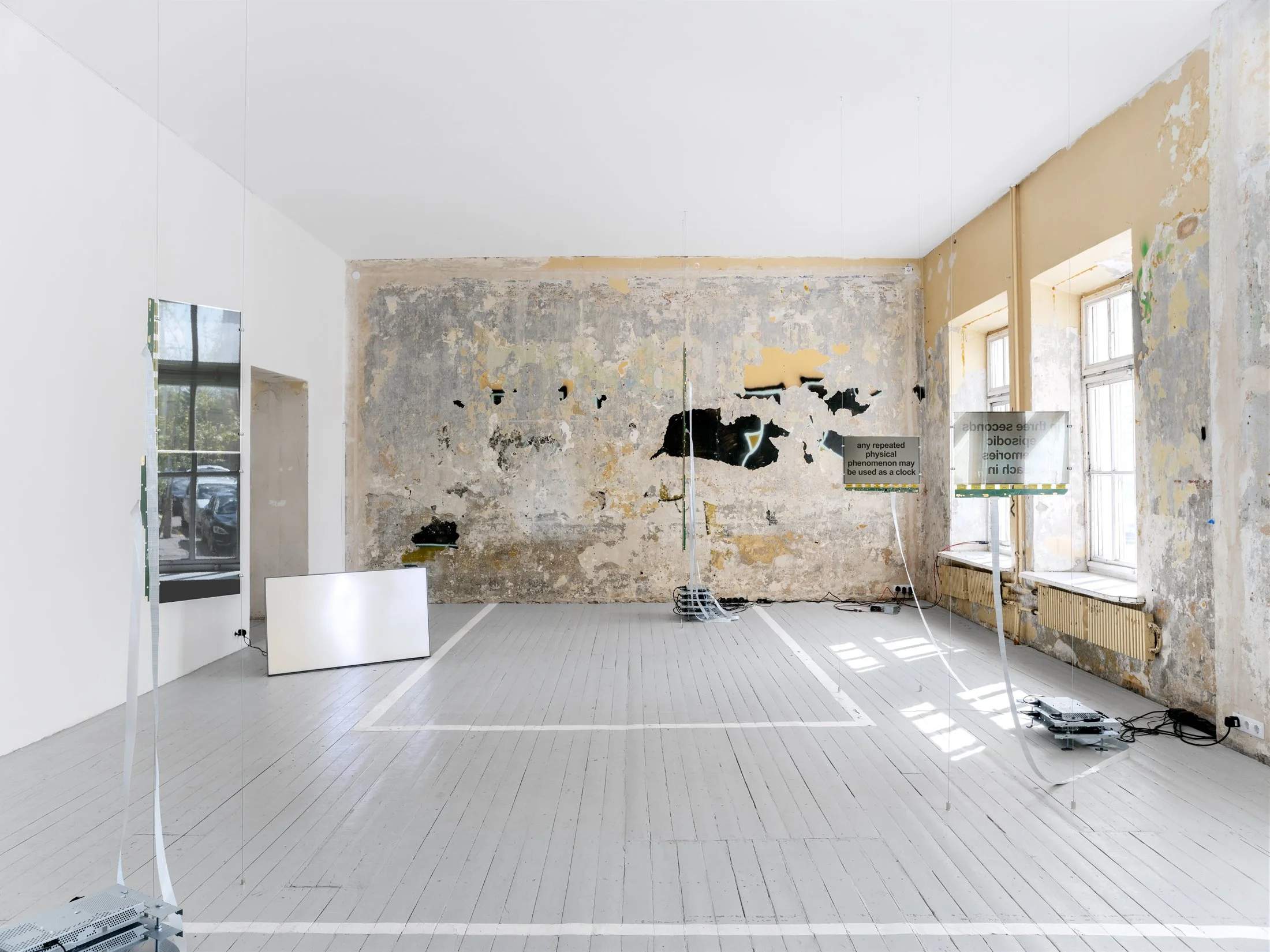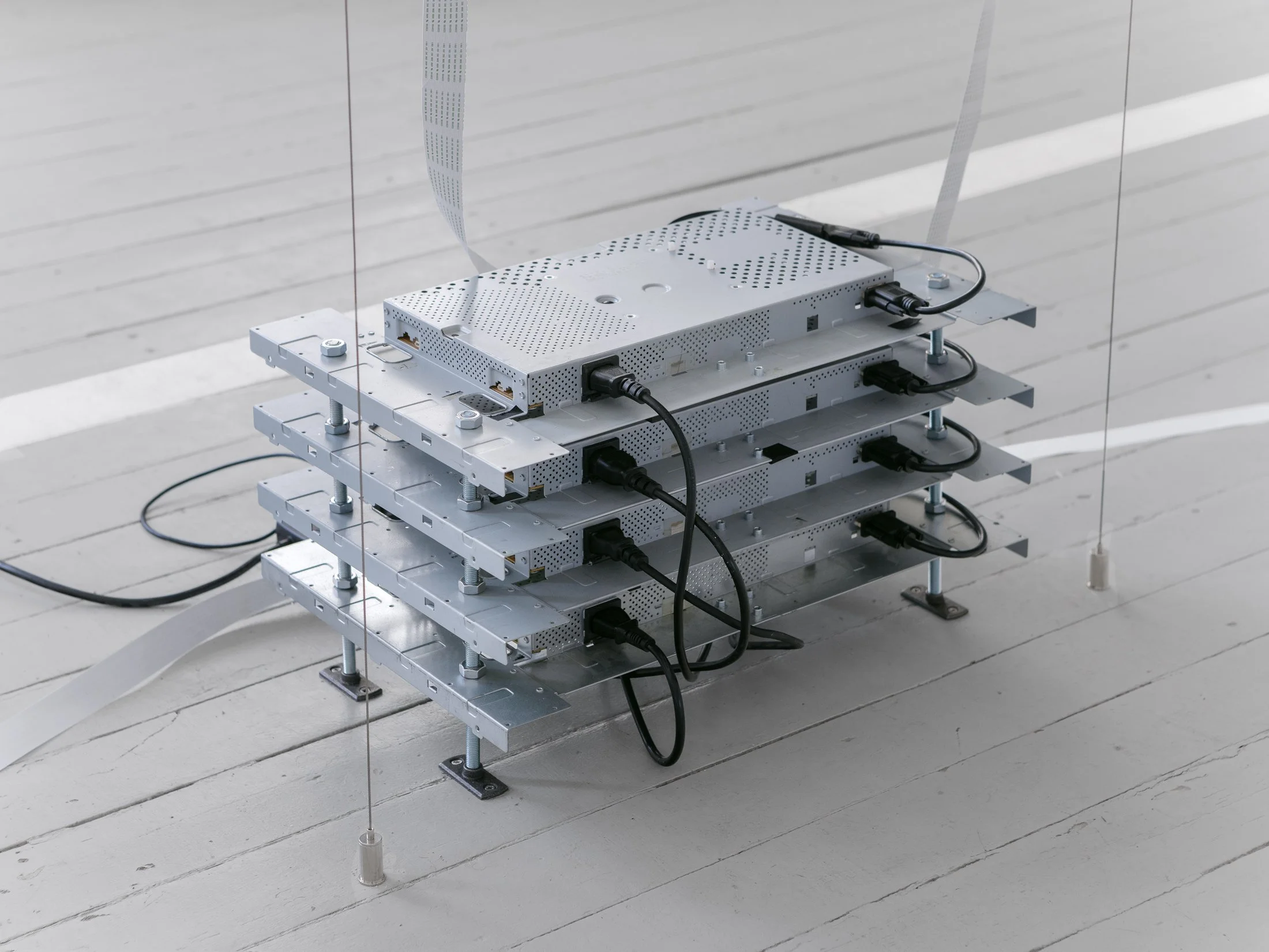 Mechanical processes powering these systems fill the space with sounds of clicks, whirrs and a low hum of white noise, which are occasionally intercepted by sound signals. At this moment, a weather satellite is passing in a sun-synchronous orbit above Vilnius, transmitting signals to an antenna secured on the building’s rooftop. As this system forgoes the last step of translating the signals into readable radar images, the gallery visitors are left only with the knowledge of a satellite passing above.