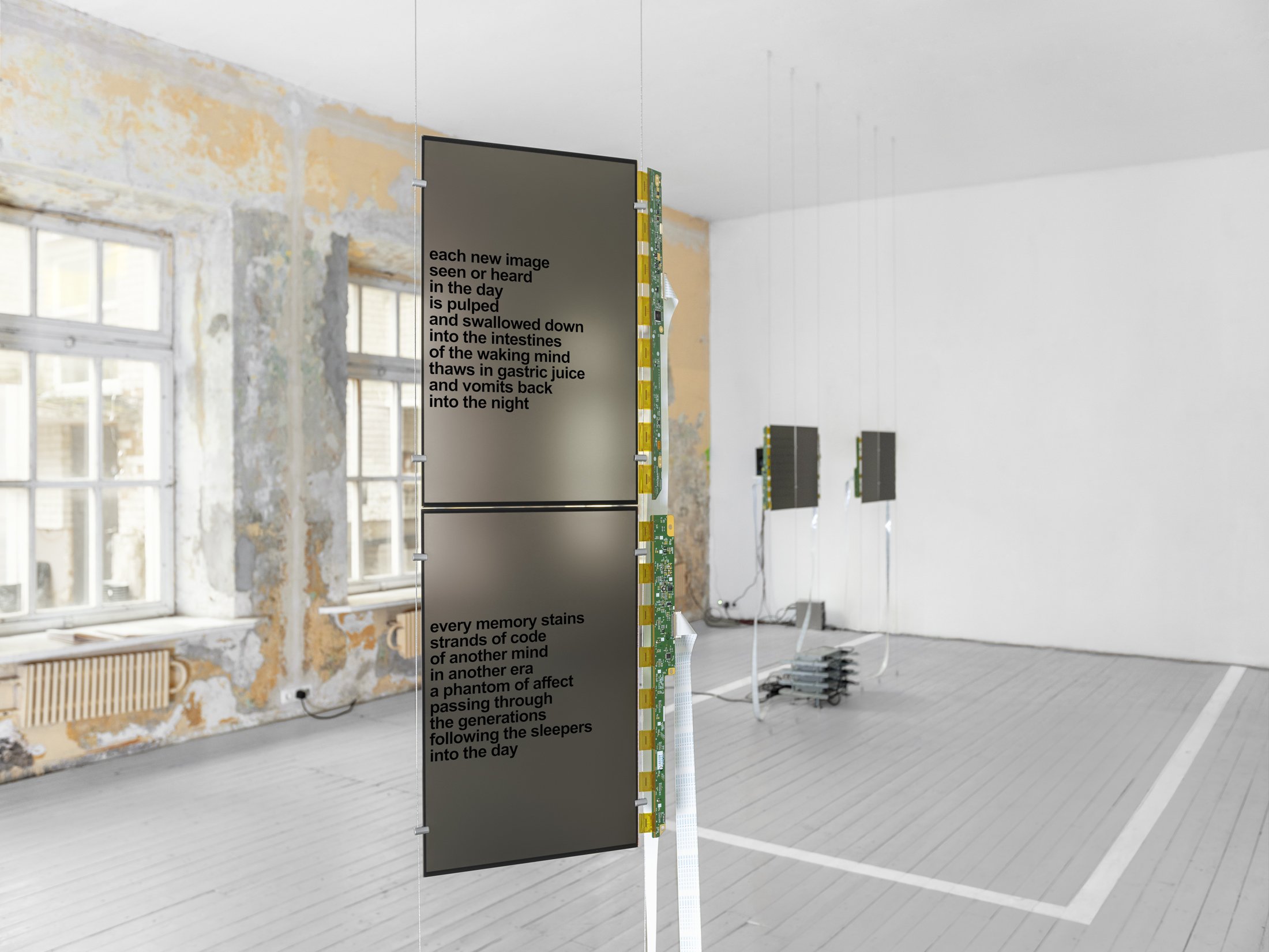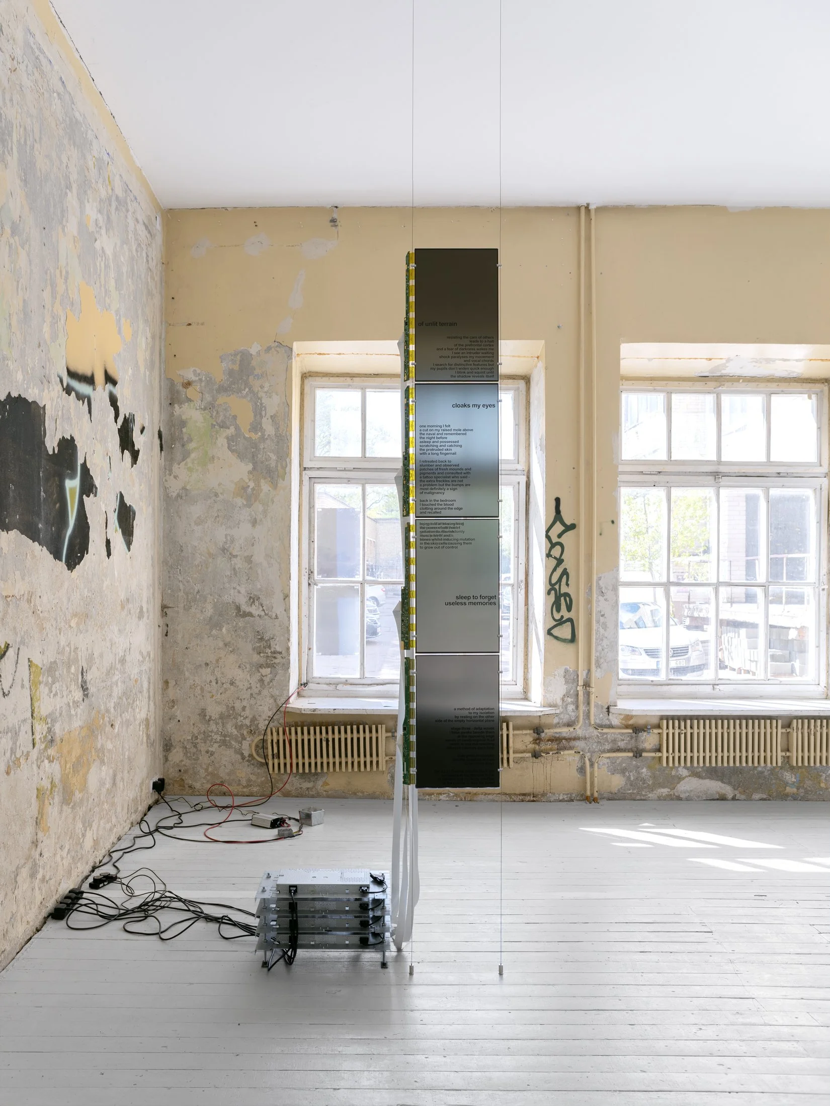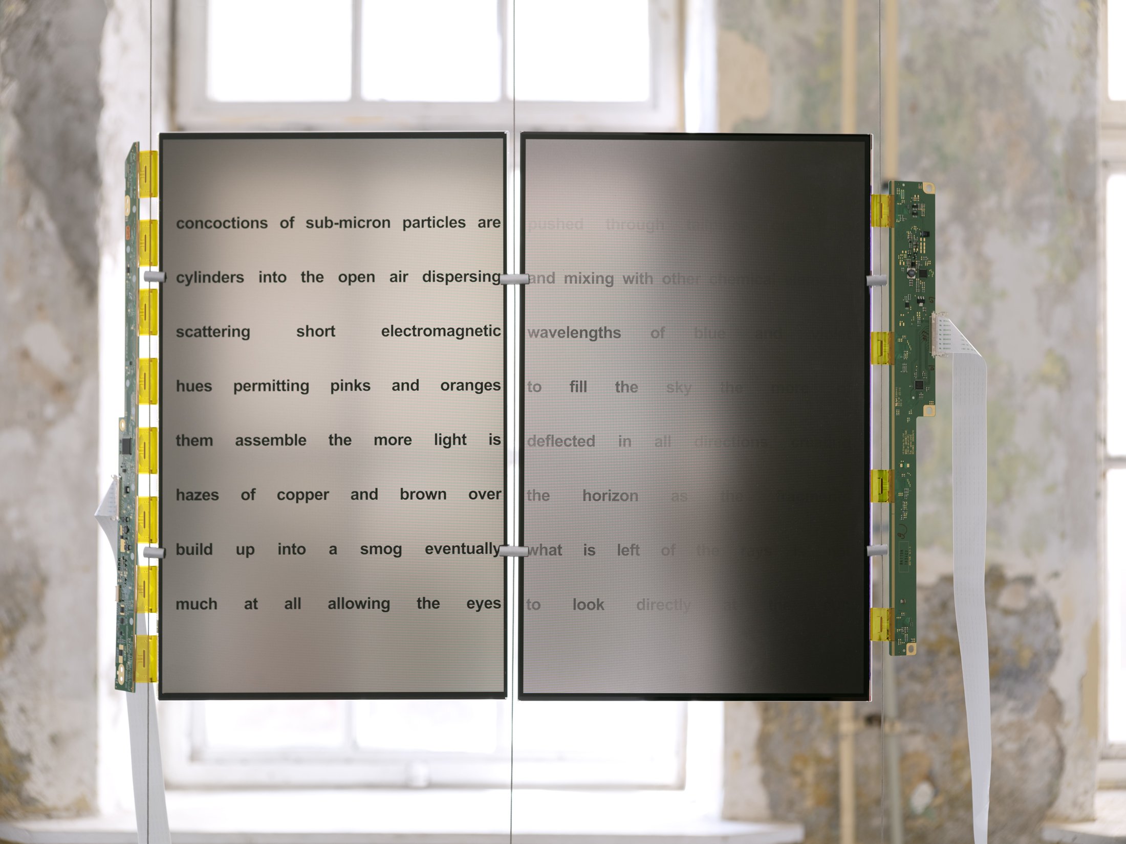 In the room illuminated by daylight, Kononenko reconfigures technology into a framework for exploring the fragility of intertwined systems. The gallery space is filled with screens, which are taken apart and reassembled into sculptural formations. With artificial light missing, these objects become permeable, seen only in daylight. Different light filters have been transported from the screens to the windows; refracting hues of sunlight into the space, and making the gallery’s architecture integral to being able to see the piece wave-like disturbance (2024). In an orange, some lenses and a flower (the structure of the eye explained by means of models and diagrams) (2024) what is left from the screen is a coded backlight, ghost-like shadowing abstract shapes of missing pixels. In her installation, Kononenko treats electrical current and its absence as a tangible material. Whilst pain gate; clock (2024) has a programmed relay allowing and stopping the flow of electricity at timed intervals, a feeling almost instinct (2024) relies on conversion and transmission of solar energy in real time. The work connected to solar panels is controlled by a sensor switch instead of a battery bank, turning on and off in response to sunlight moving across the panels throughout the day. These viewing systems carry Kononenko’s writing on embodied feeling, perception of time, memories, dreams, and bodily symptoms. The text appears on screens in pulses and rhythms, demanding the visitor’s focus and speed of attention to keep up with the work. In these puzzle-like configurations, sentences of scientific descriptions sometimes break apart and absurdities of language are highlighted.