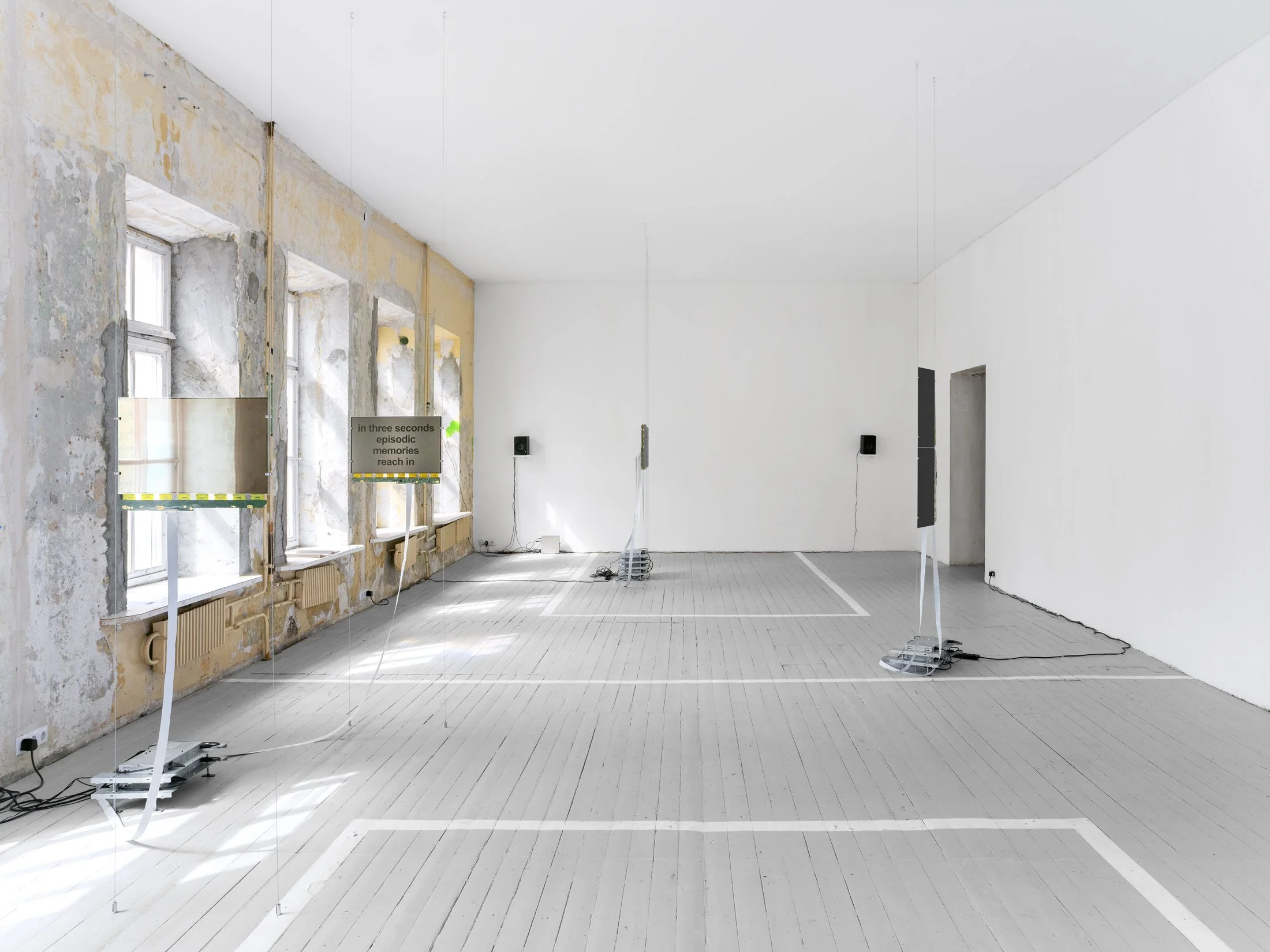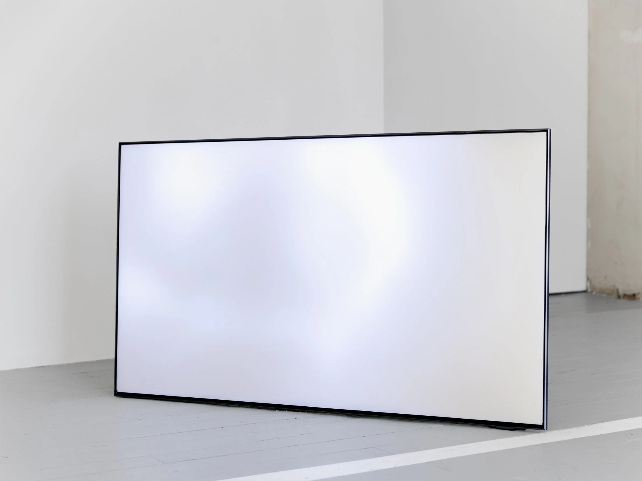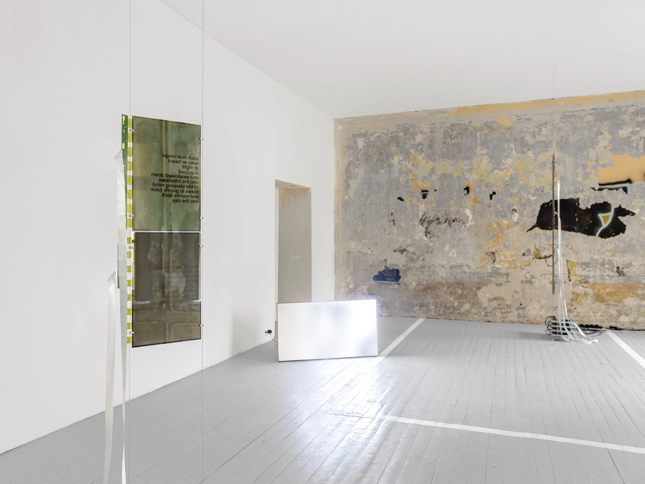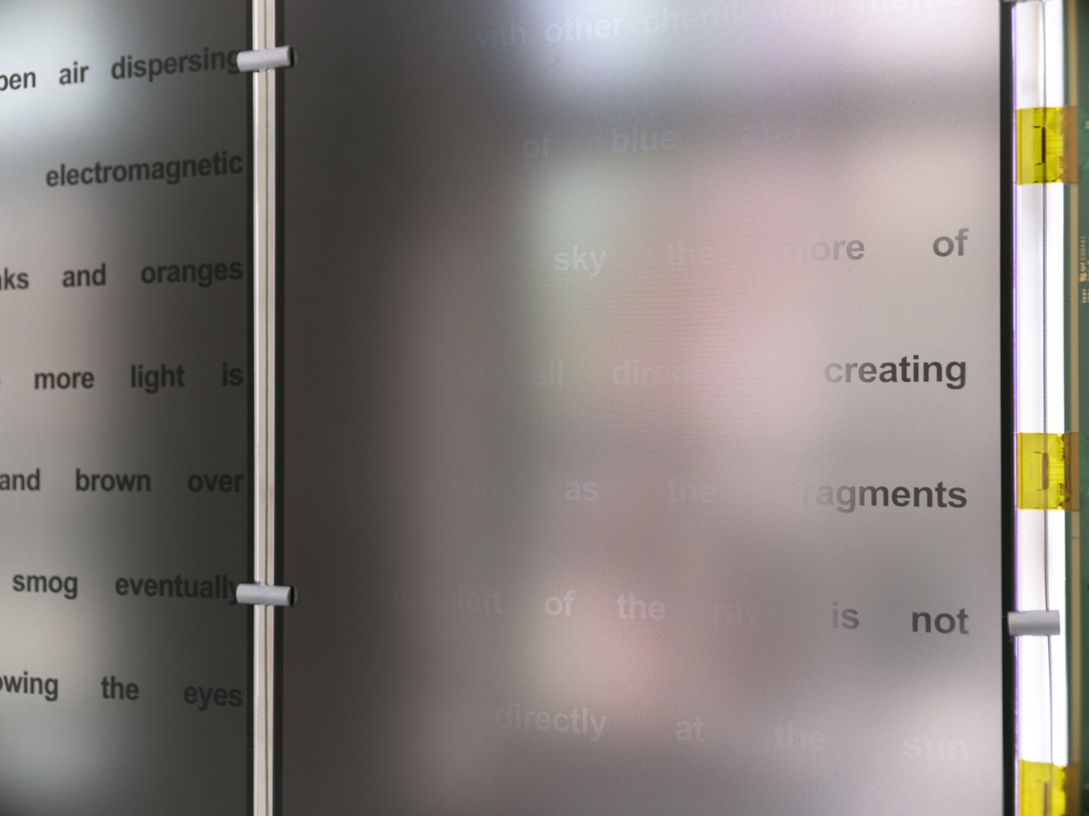 In the room illuminated by daylight, Kononenko reconfigures technology into a framework for exploring the fragility of intertwined systems. The gallery space is filled with screens, which are taken apart and reassembled into sculptural formations. With artificial light missing, these objects become permeable, seen only in daylight. Different light filters have been transported from the screens to the windows; refracting hues of sunlight into the space, and making the gallery’s architecture integral to being able to see the piece wave-like disturbance (2024). In an orange, some lenses and a flower (the structure of the eye explained by means of models and diagrams) (2024) what is left from the screen is a coded backlight, ghost-like shadowing abstract shapes of missing pixels. In her installation, Kononenko treats electrical current and its absence as a tangible material. Whilst pain gate; clock (2024) has a programmed relay allowing and stopping the flow of electricity at timed intervals, a feeling almost instinct (2024) relies on conversion and transmission of solar energy in real time. The work connected to solar panels is controlled by a sensor switch instead of a battery bank, turning on and off in response to sunlight moving across the panels throughout the day. These viewing systems carry Kononenko’s writing on embodied feeling, perception of time, memories, dreams, and bodily symptoms. The text appears on screens in pulses and rhythms, demanding the visitor’s focus and speed of attention to keep up with the work. In these puzzle-like configurations, sentences of scientific descriptions sometimes break apart and absurdities of language are highlighted.