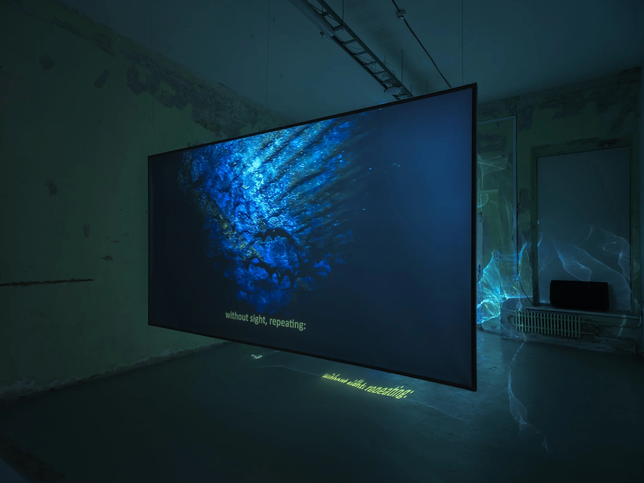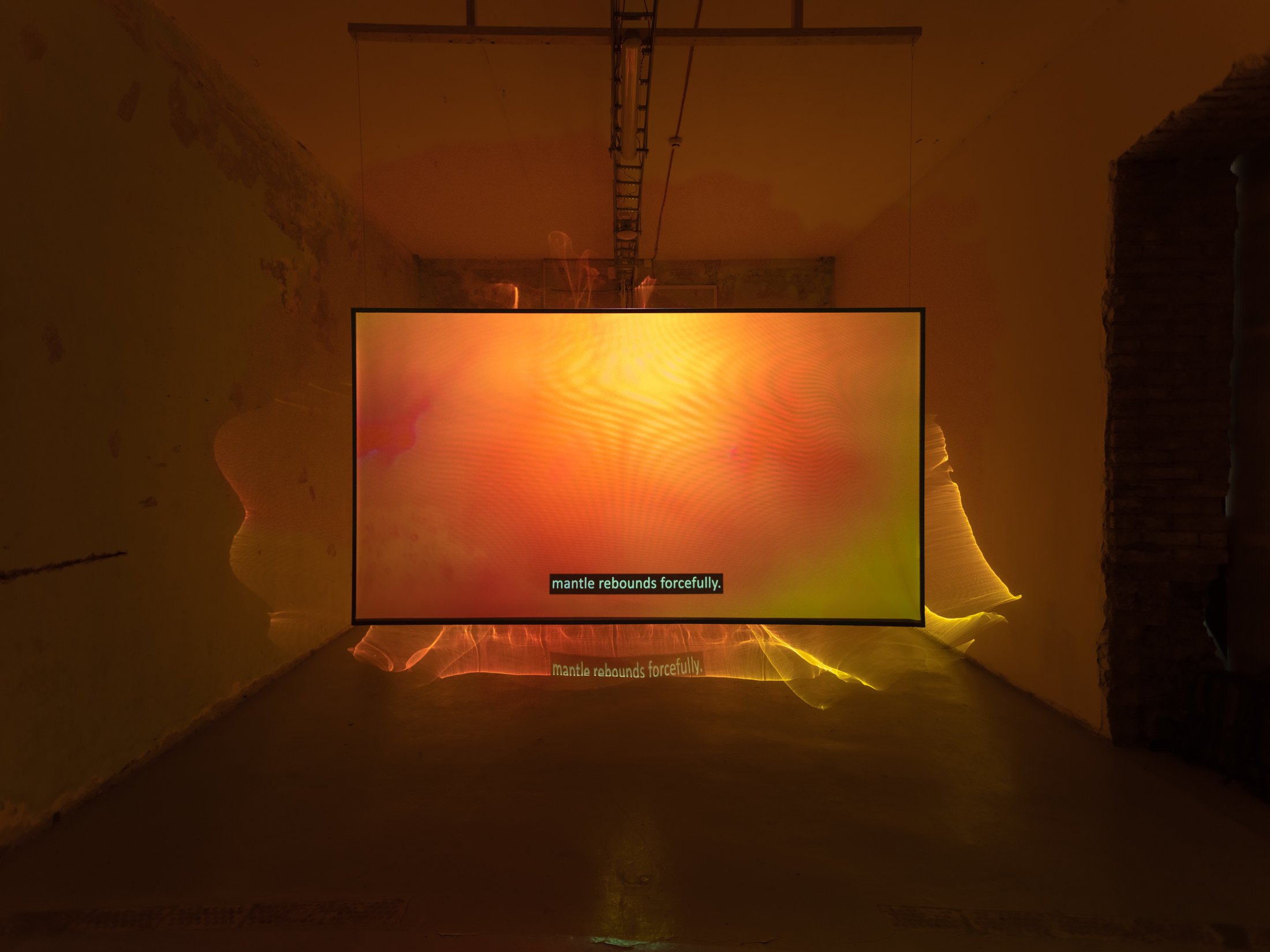 The title Subsuns acts as an opening to various pathways intersecting in the time-based installation and video works presented in this exhibition. It refers to an optical phenomenon – a mirroring of the sun below the horizon, which is conditioned by the atmosphere. This fake sun can be seen from an airplane as a reflection in the clouds. The optical phenomenon of subsuns also carries another meaning related to “fire” and “signal” economies. In his book The Parasite (1982), philosopher Michel Serres refers to it as a representation of a desire to imitate the sun on Earth – the ultimate expression of capital. He elaborates on the phenomenon of subsuns as reservoirs of oil, gas, coal, dammed rivers, databases, and satellites put into orbit to facilitate uninterrupted flows of information and capital. However, when the title is translated into Lithuanian, the term subsuns (posaulės) sounds like a multiplicity of worlds (pasauliai), losing its initial meaning of fake suns. In the moment of translation, the exhibition title acquires another purpose, an invitation to imagine alternative ways of being-with the world.