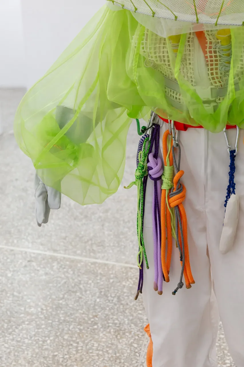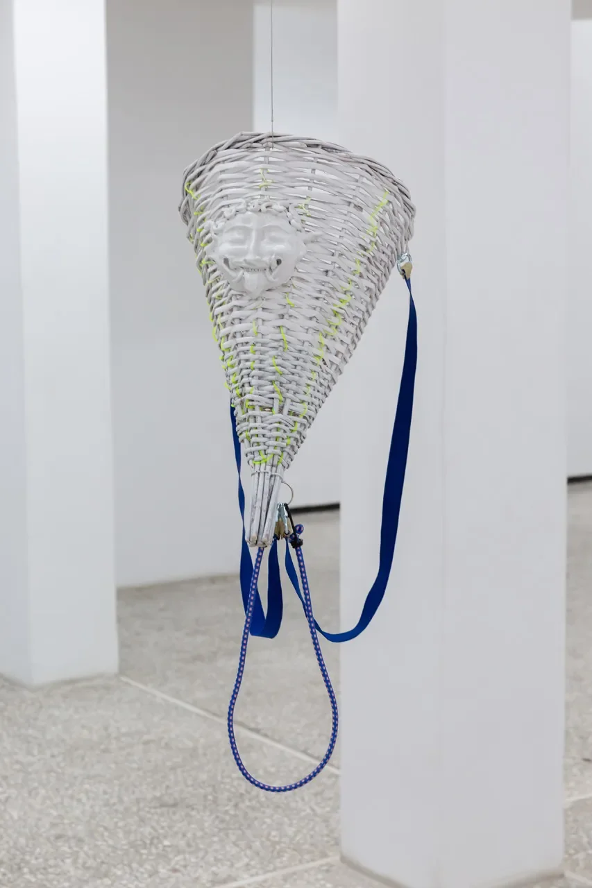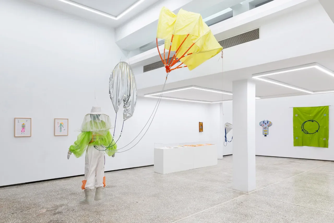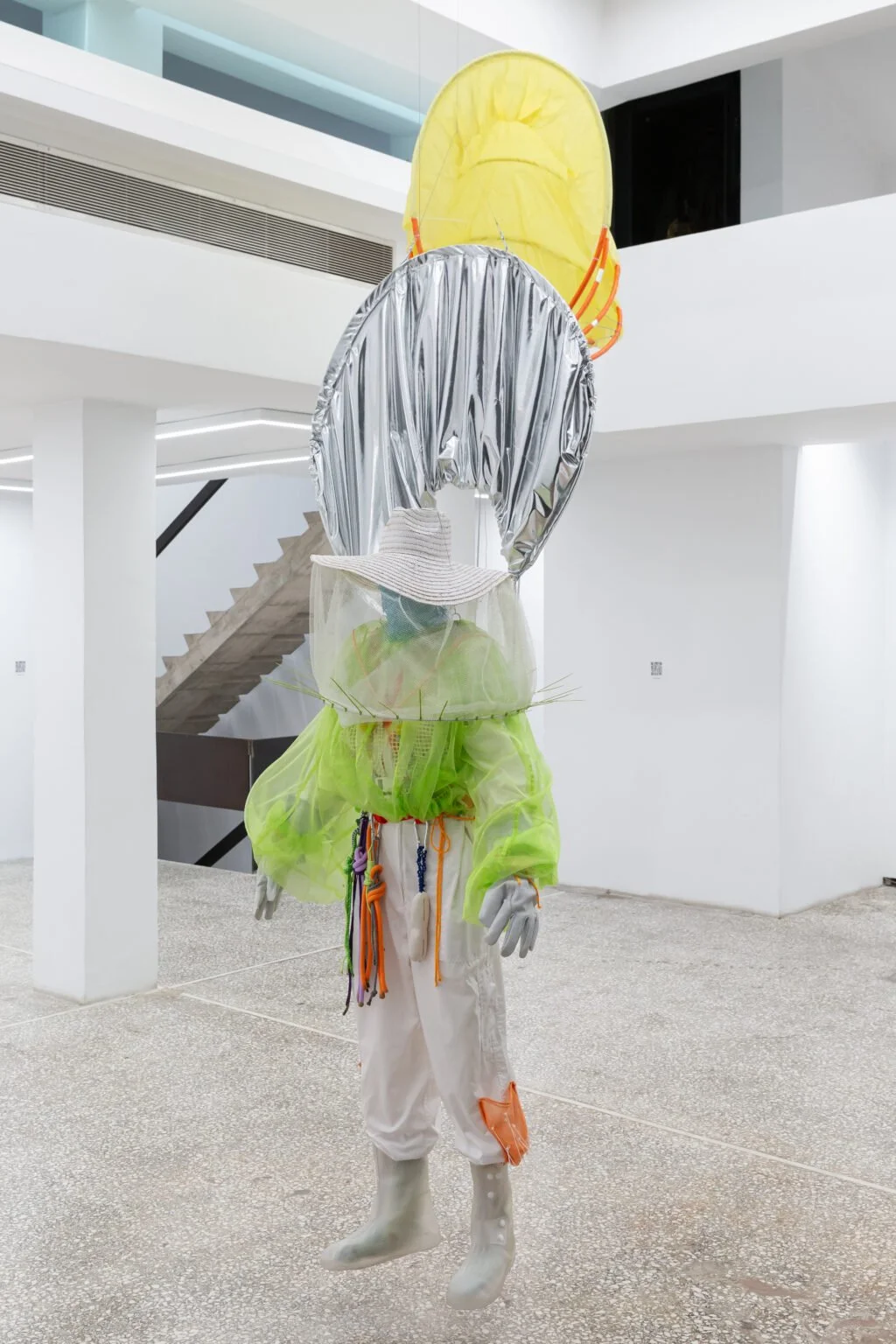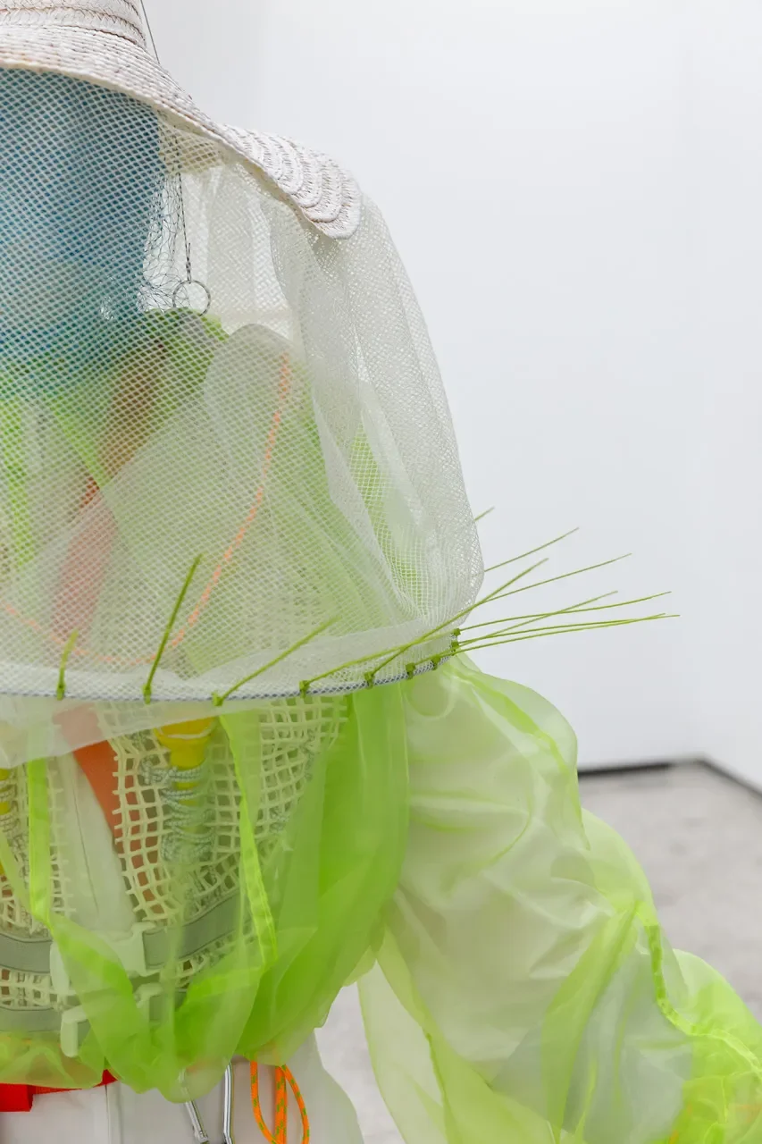 Kyriaki Goni, The Beeseeker, 2024, uniform, parasol, parachute, mixed media, appx 300 x 260 x 90 cm