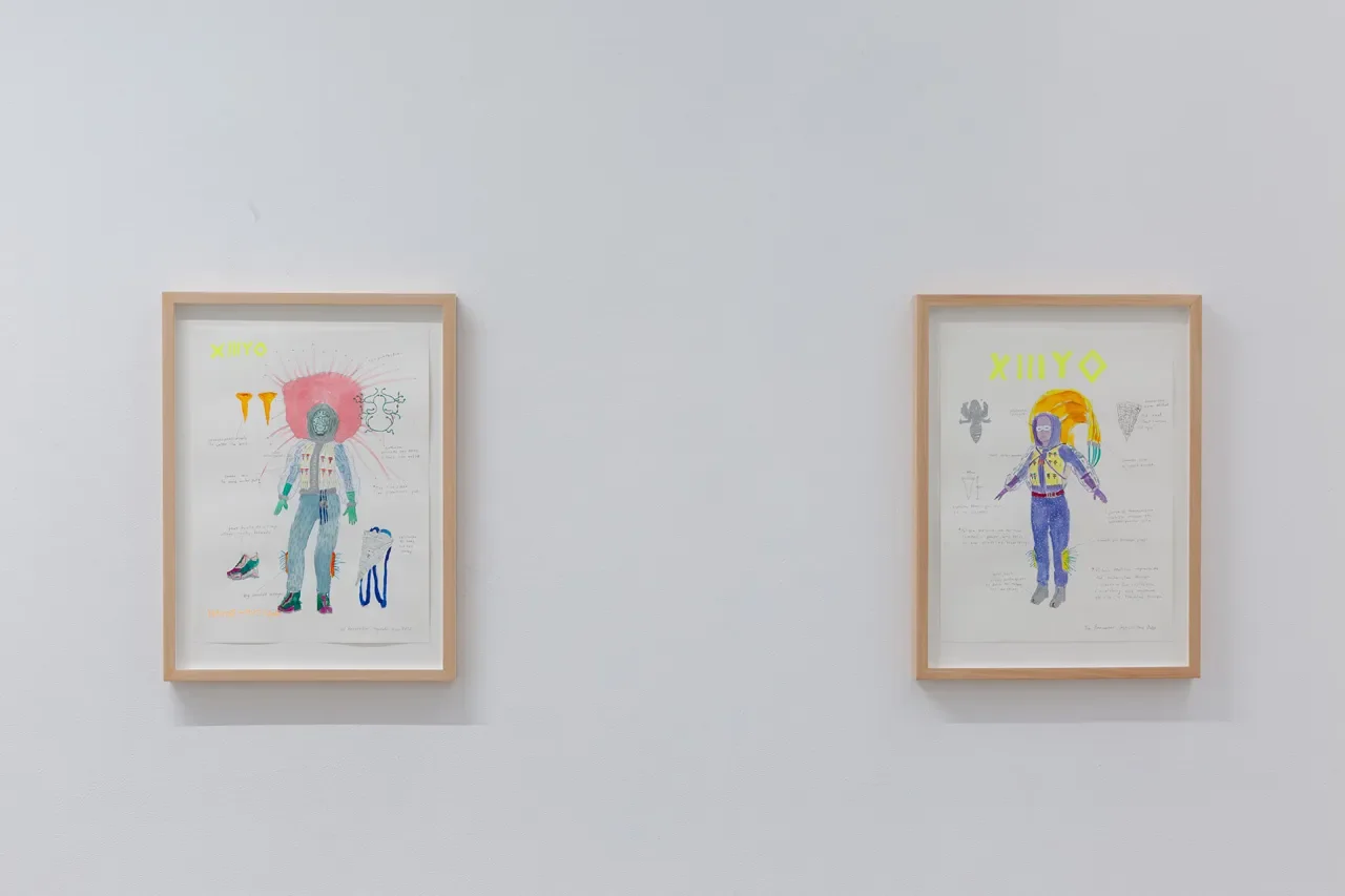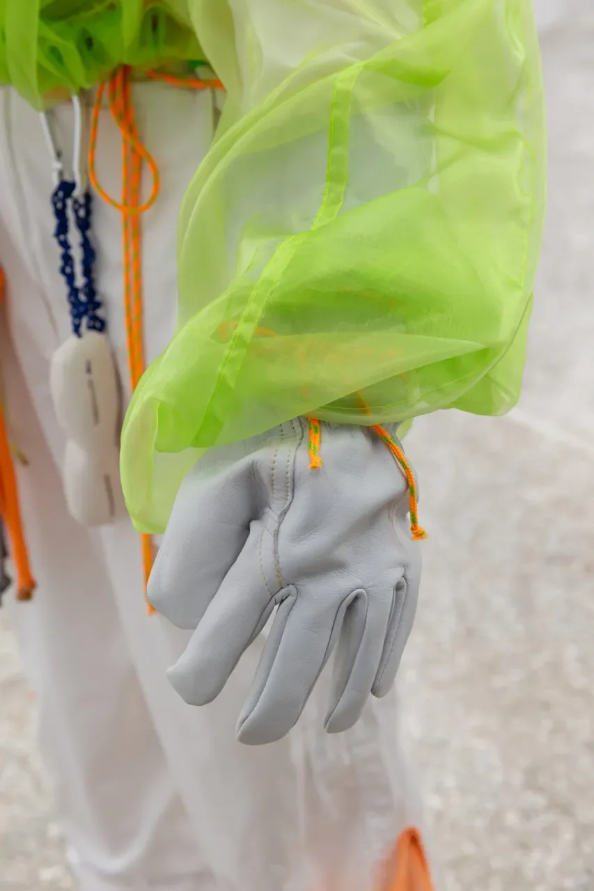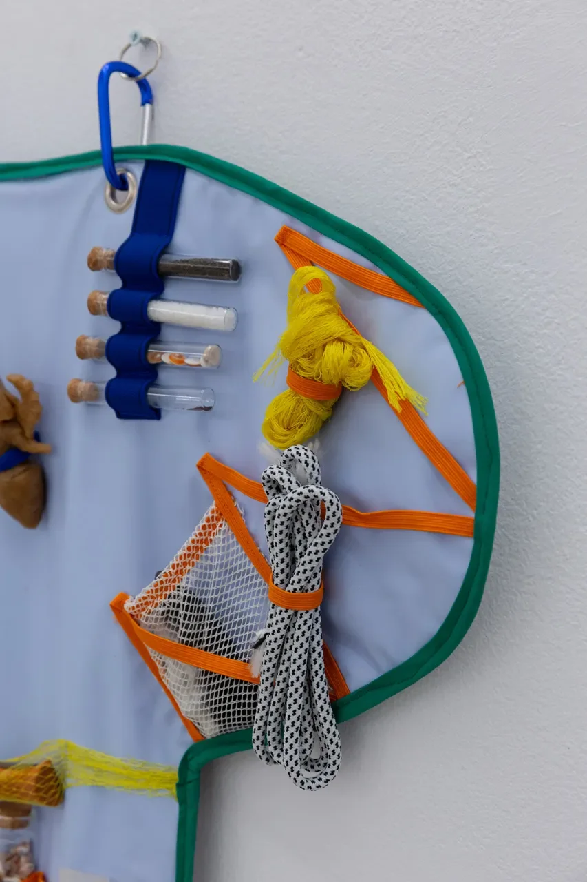 Central to this narrative is the figure of the Beeseeker, a protagonist dressed in a retro-futuristic, handcrafted shell suit, navigating an Aegean landscape depleted by mass tourism, drought, heat and environmental degradation. Drawing equally from science fiction aesthetics and rural ingenuity, the Beeseeker’s attire evokes both survival gear and ceremonial costume. Questions of orientation and relation whether socially, ethically or spatially, reoccur throughout the work, informed by the ways bees navigate through space, communicate within the swarm, and sustain collective life.