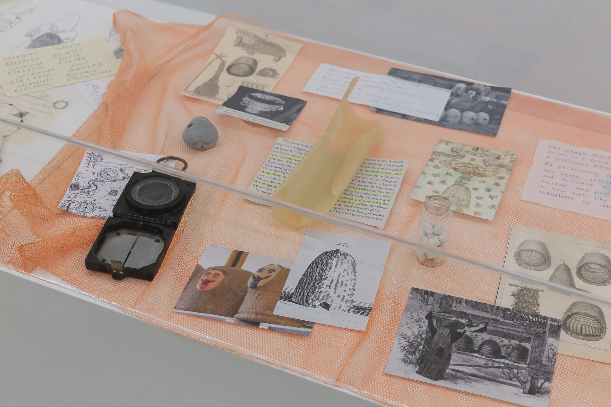 Telling the Bees is a multifaceted installation composed of video works, sculptural objects, drawings, notes, textiles, sound, and ritual artifacts. Time within the installation unfolds as non-linear, layering historical reference, lived experiences and imagined futures in a way that is reminiscent of spoken tradition. The viewer encounters a constellation of materials: offerings, tools, talismans and archival research which hold memories and echo the artist’s labor and creative process, suggesting an unfolding narrative rather than a fixed conclusion.