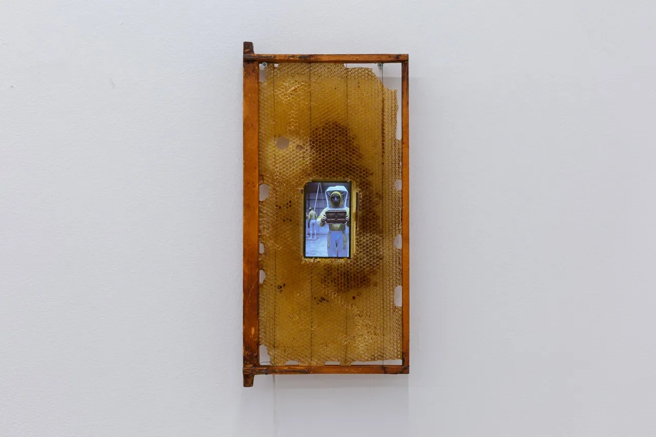 Kyriaki Goni, Dreaming of a Collective Mind, 2024, beehive, video in collaboration with AI, 2:54 min, 44.5 x 23 x 5 cm