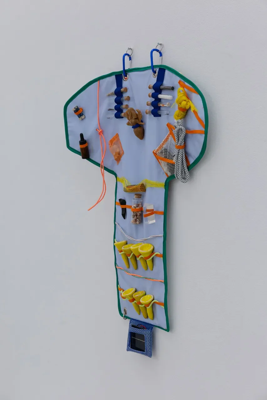 Kyriaki Goni, Portable bee shrine, 2024 beeswax sculpture, seeds, obsidian, fishing net, fishing knife, compass, ceramic pots, ceramic talisman, solar panel, lemongrass oil, prism, soil, 87 x 59 x 6 cm